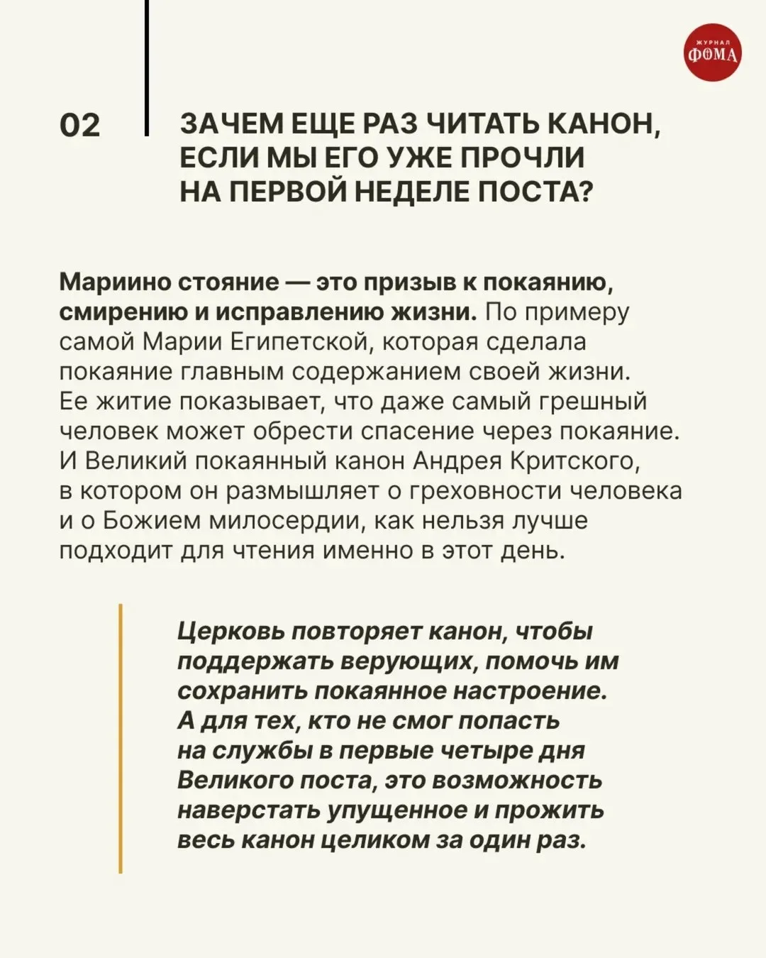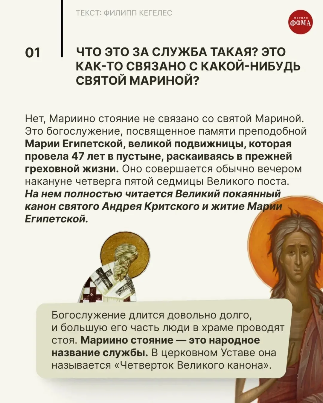 Сегодня во всех храмах! В среду вечером на пятой седмице Великого поста совершается необычное богослужение, известное как Мариино стояние. Что это за служба? Почему у нее такое название? Зачем на ней снова читается покаянный канон Андрея Критского? Разбираемся вместе в слайдах, листайте ☝️➡️