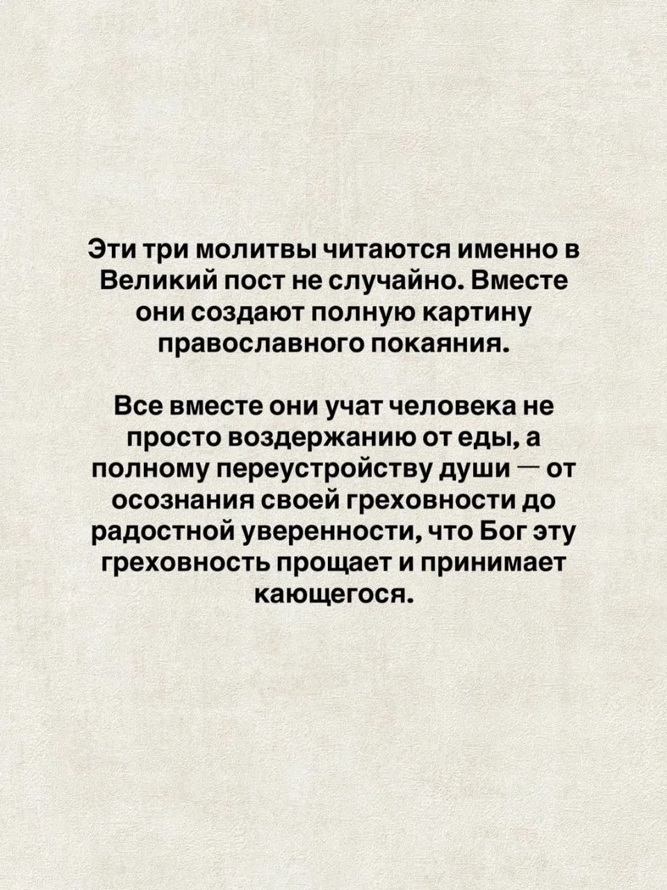 Эти три молитвы читаются именно в Великий пост не случайно. Вместе они создают полную картину православного покаяния 👆🏻🫂❤️🩹