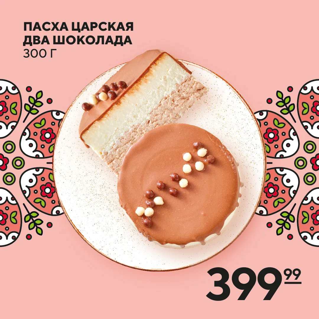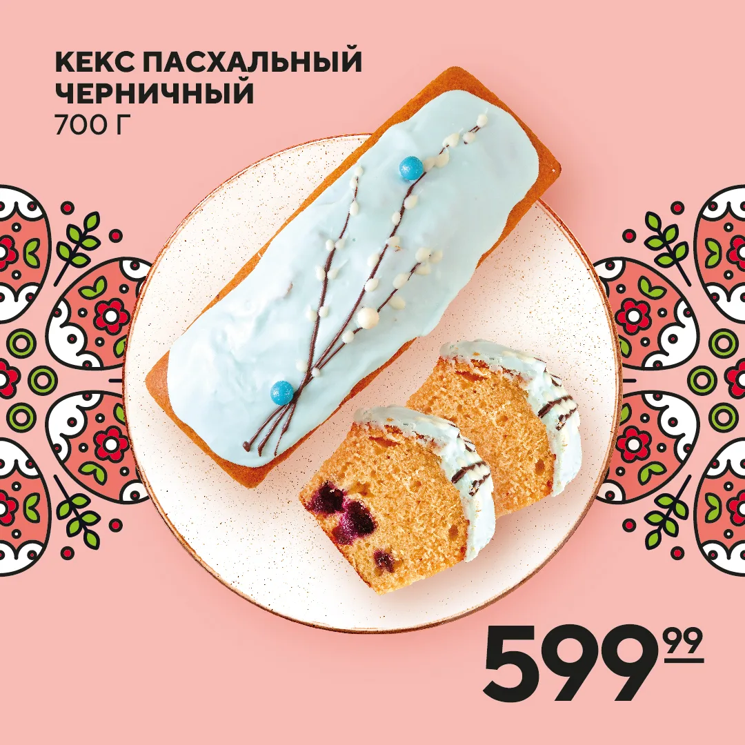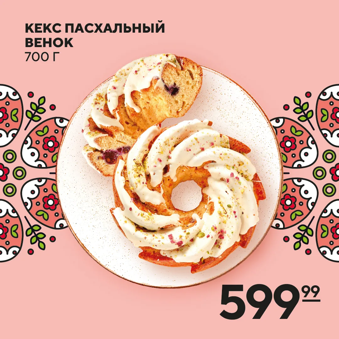 А ещё новинка — пасхальный венок. Ягодный кекс в белом шоколаде весом 700 граммов. Хватит на всю семью.