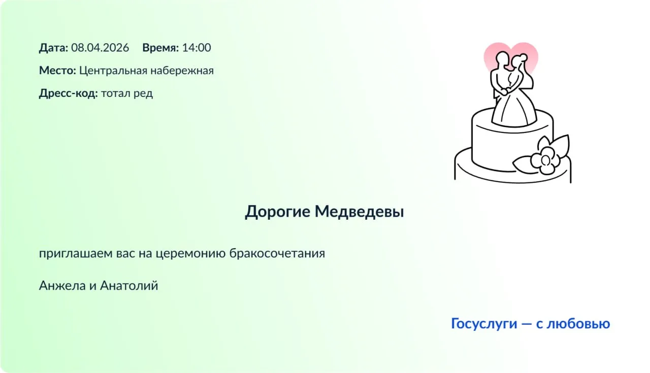 Портал Госуслуг запустил новый сервис: теперь пары, которые готовятся к свадьбе, могут оформить и отправить приглашения для гостей онлайн.