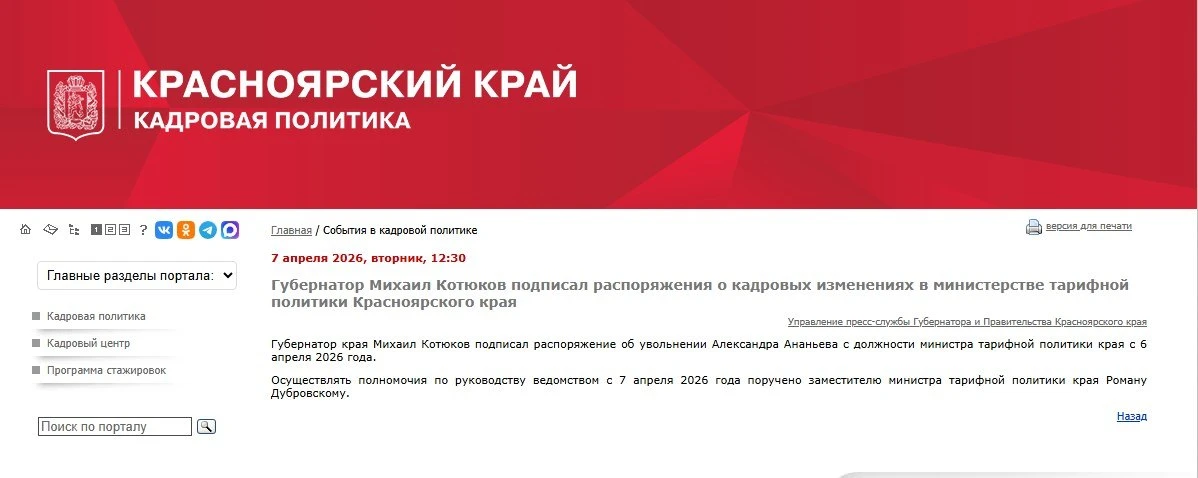 Постановление появилось на сайте правительства края. Руководить министерством будет Роман Дубровский, который работал замом Ананьева.