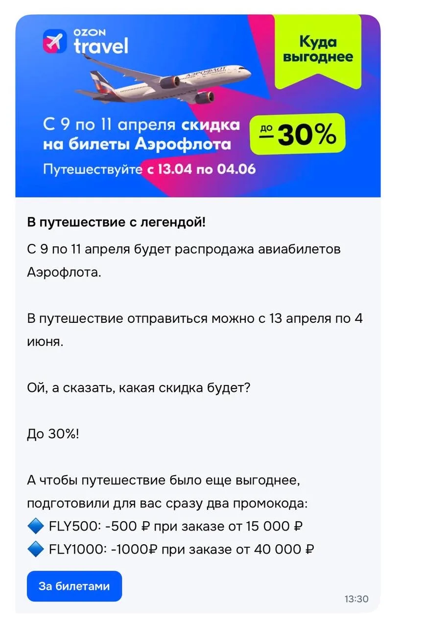 У Аэрофлота скидки до 30% на авиабилеты по России.