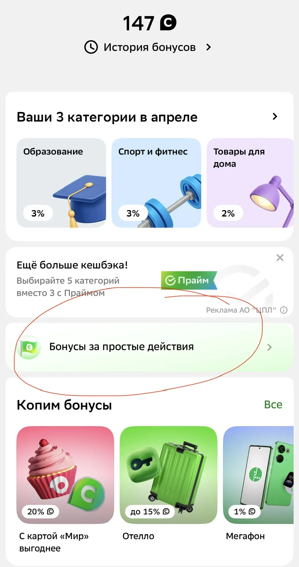На главной странице нужно нажать на «спасибо» и далее перейти в раздел «бонусы за простые действия». Есть не во всех приложениях.