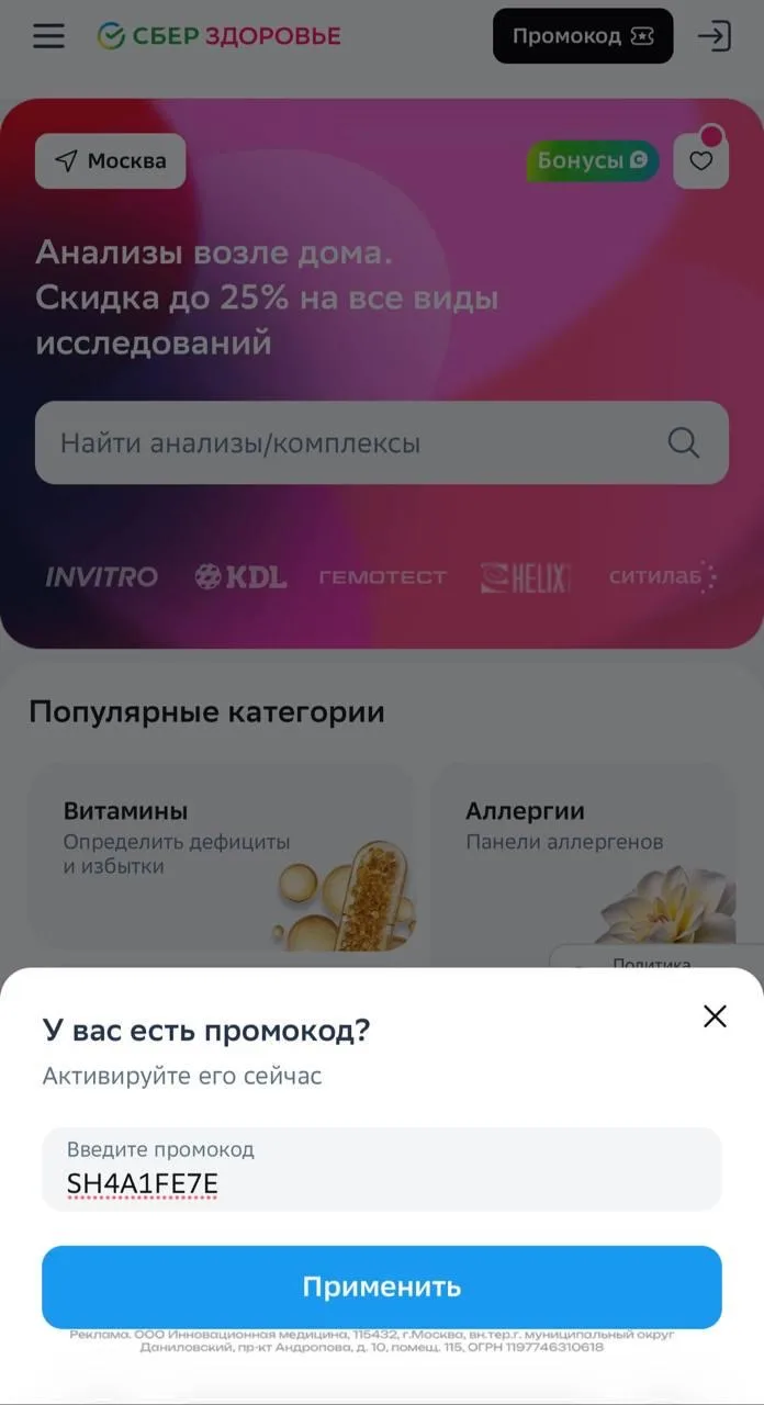 Актуальный примокод в СберЗдоровье