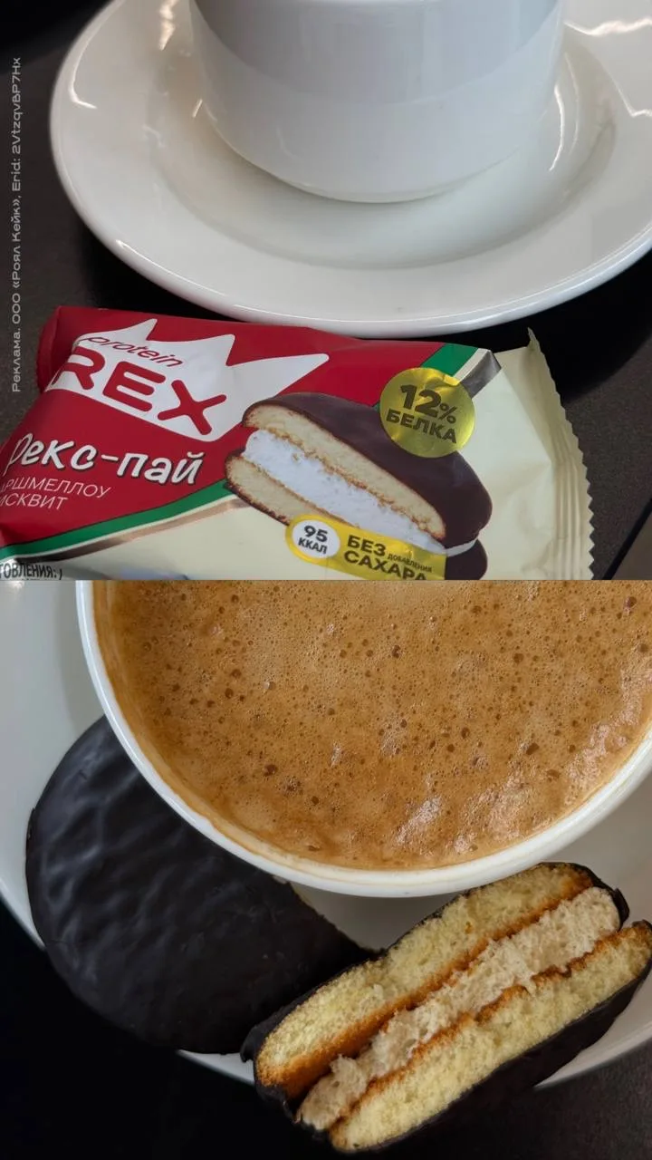 • Рекс Пай — протеиновое печенье, без добавления сахара и 95 ккал в одном пае. Ещё и 12% протеина. Вкусная глазурь, нежный бисквит и маршмелллоу.