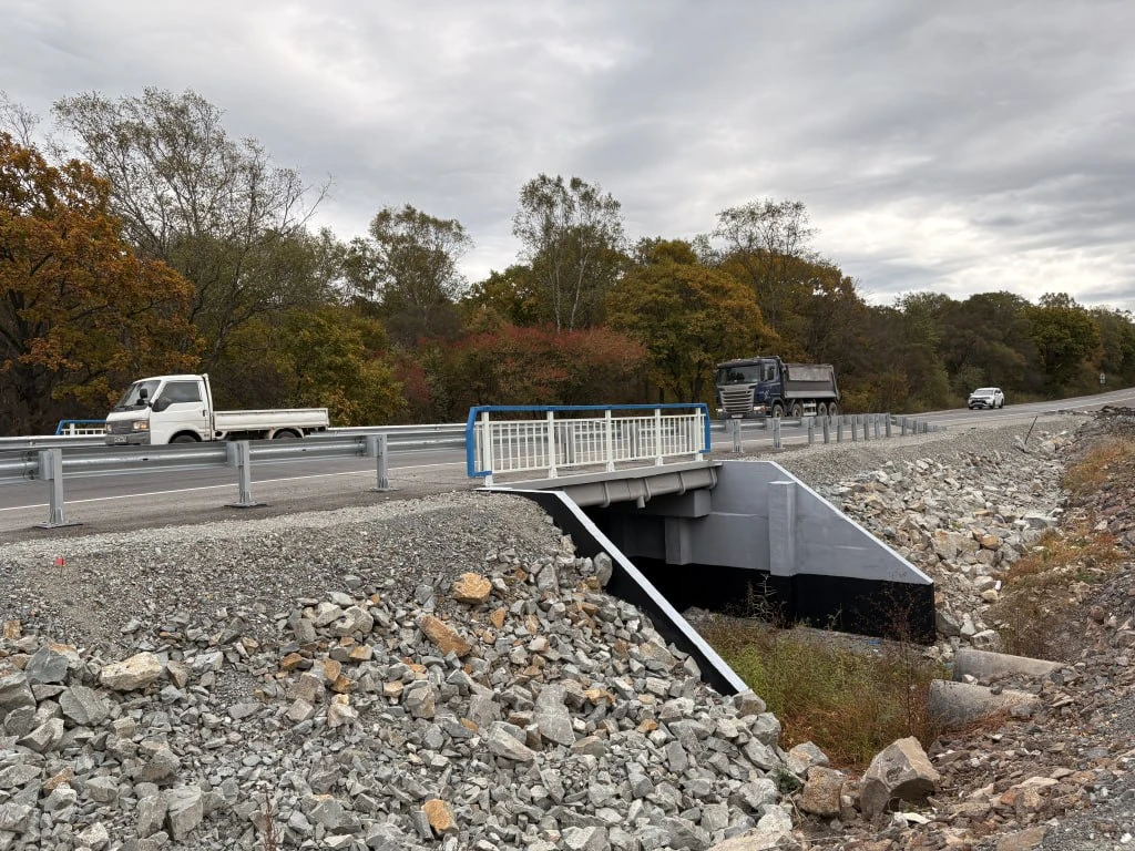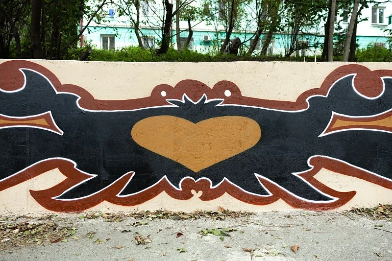🟢Так, одну подпорную стену украсили символы традиционных удэгейских узоров, но интерпретированных в авторском ключе. В основе композиций – строгая зеркальная симметрия, характерная для декоративных мотивов удэгейцев, однако формы и детали переработаны.