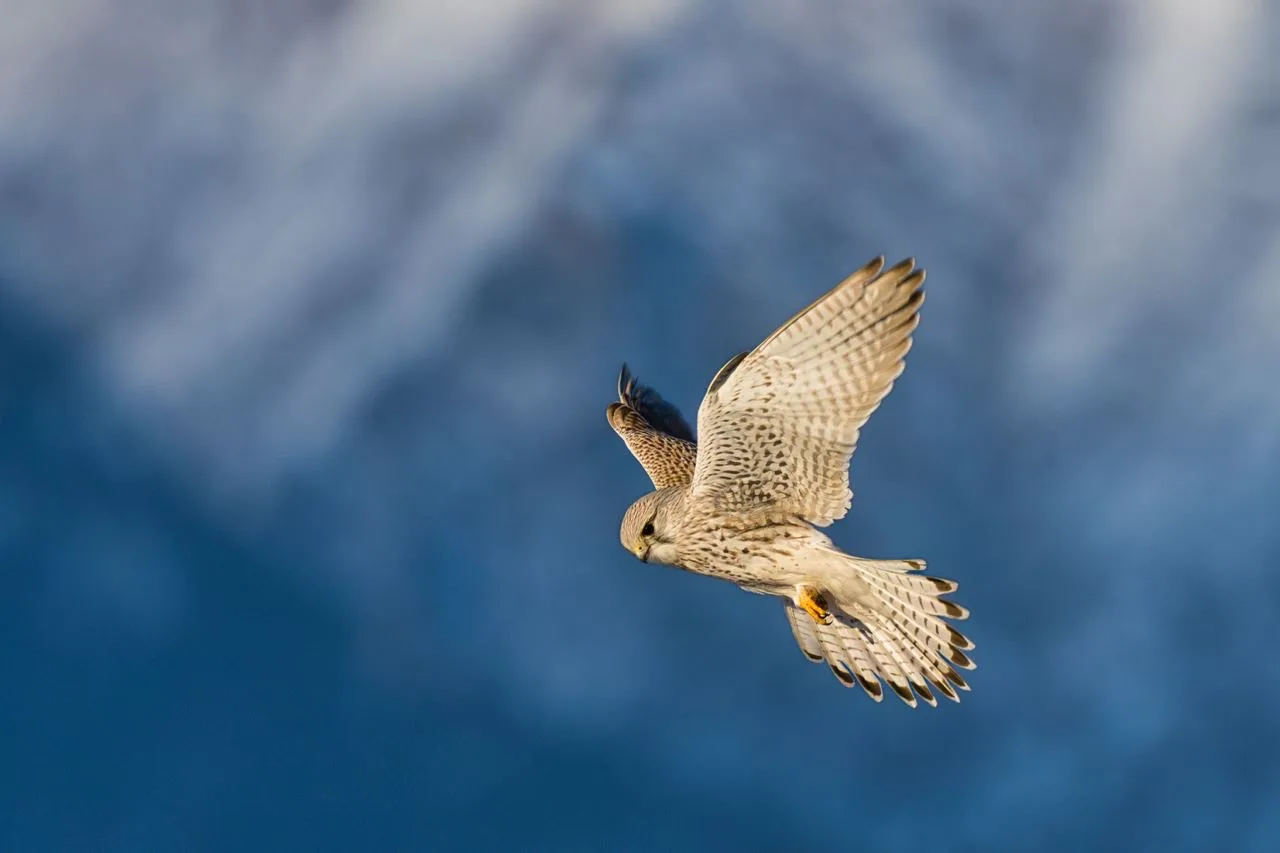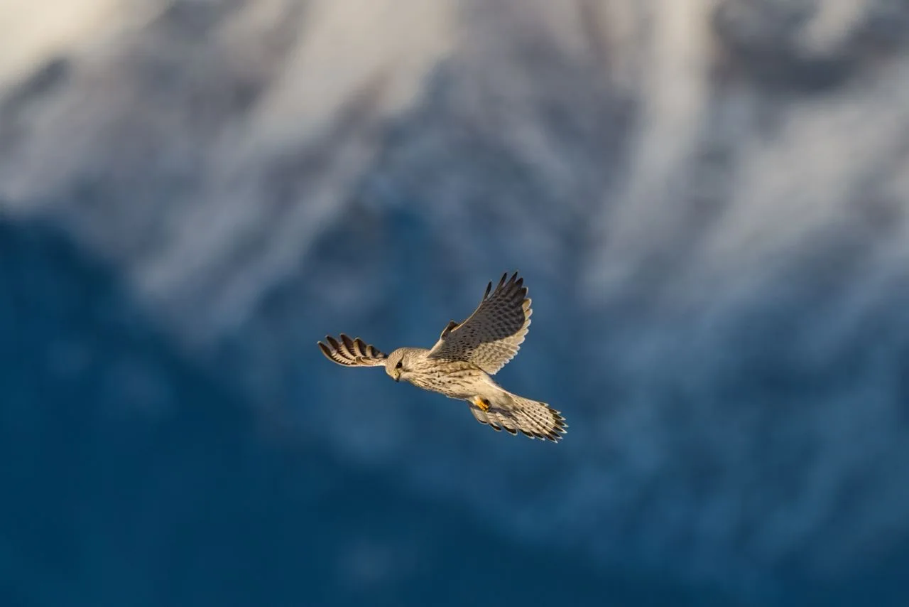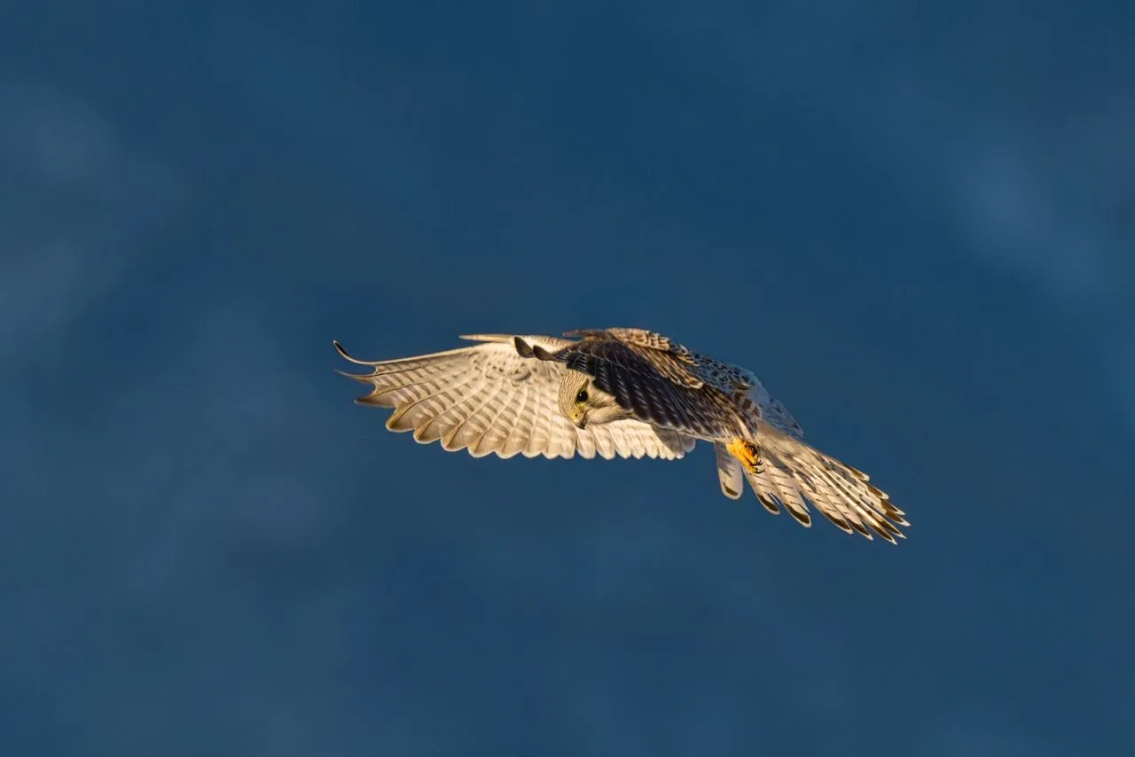 Обыкновенная пустельга зависла в полёте, высматривая жертву. Снято в районе улуса Хойто-Гол.