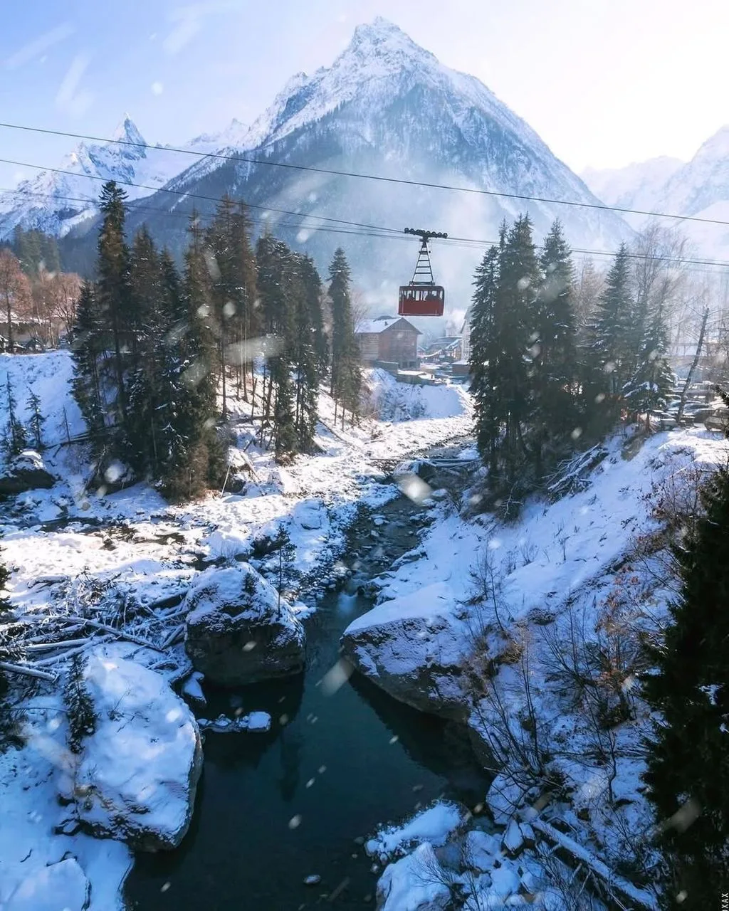 На снимках – канатка в посёлке Домбай, пик Инэ, ущелье Гоначхир, гора Домбай-Ульген и Белалакая.