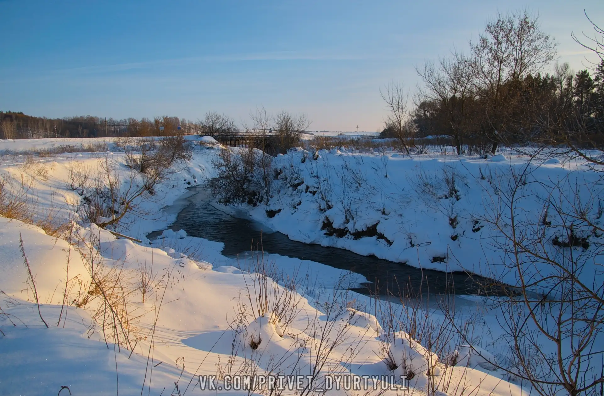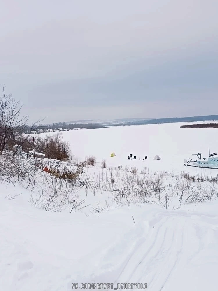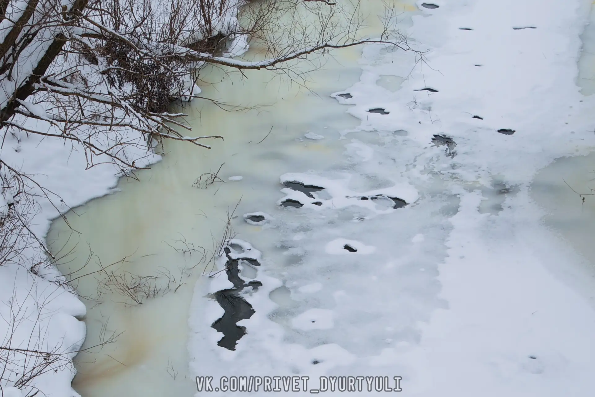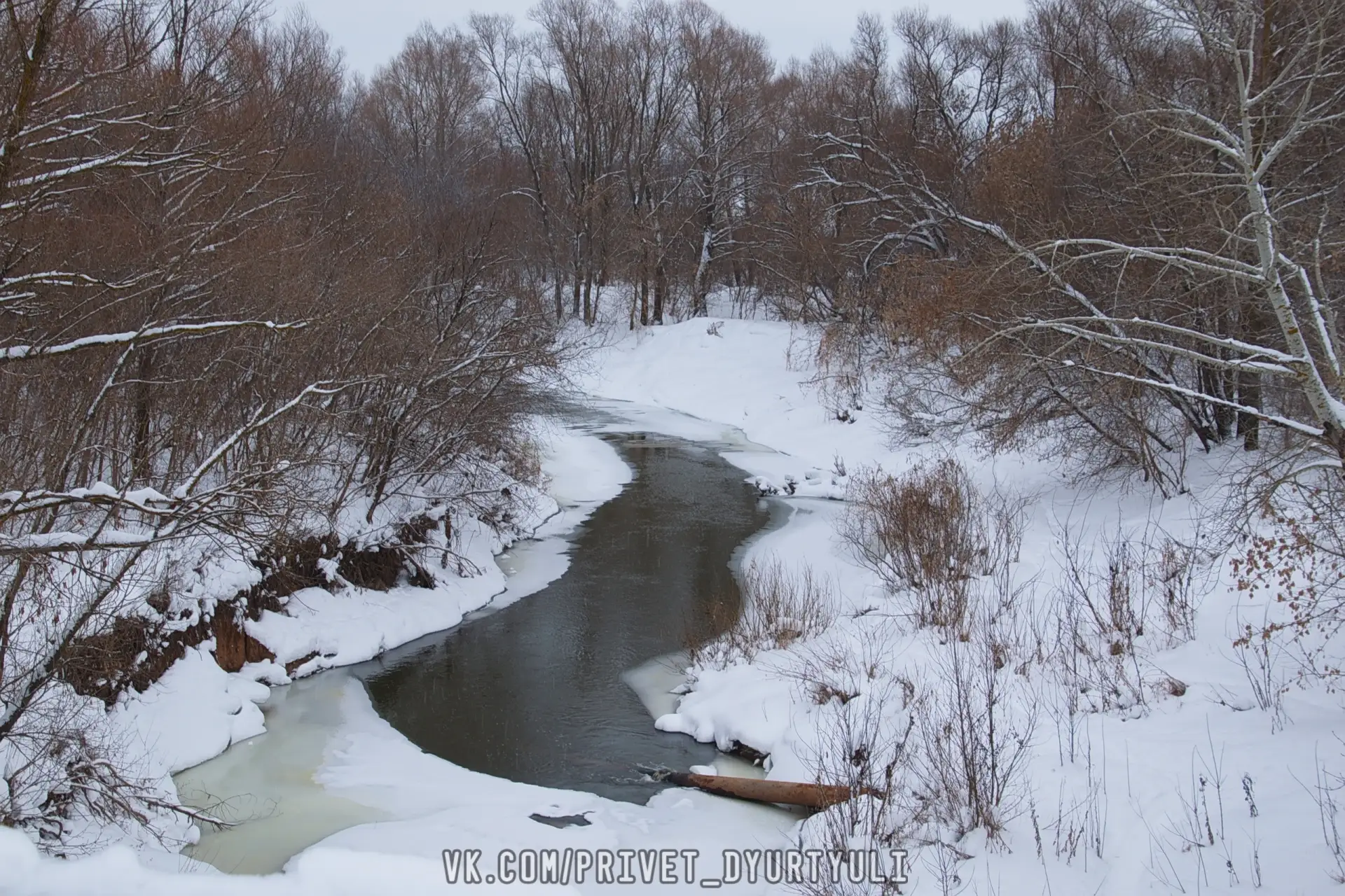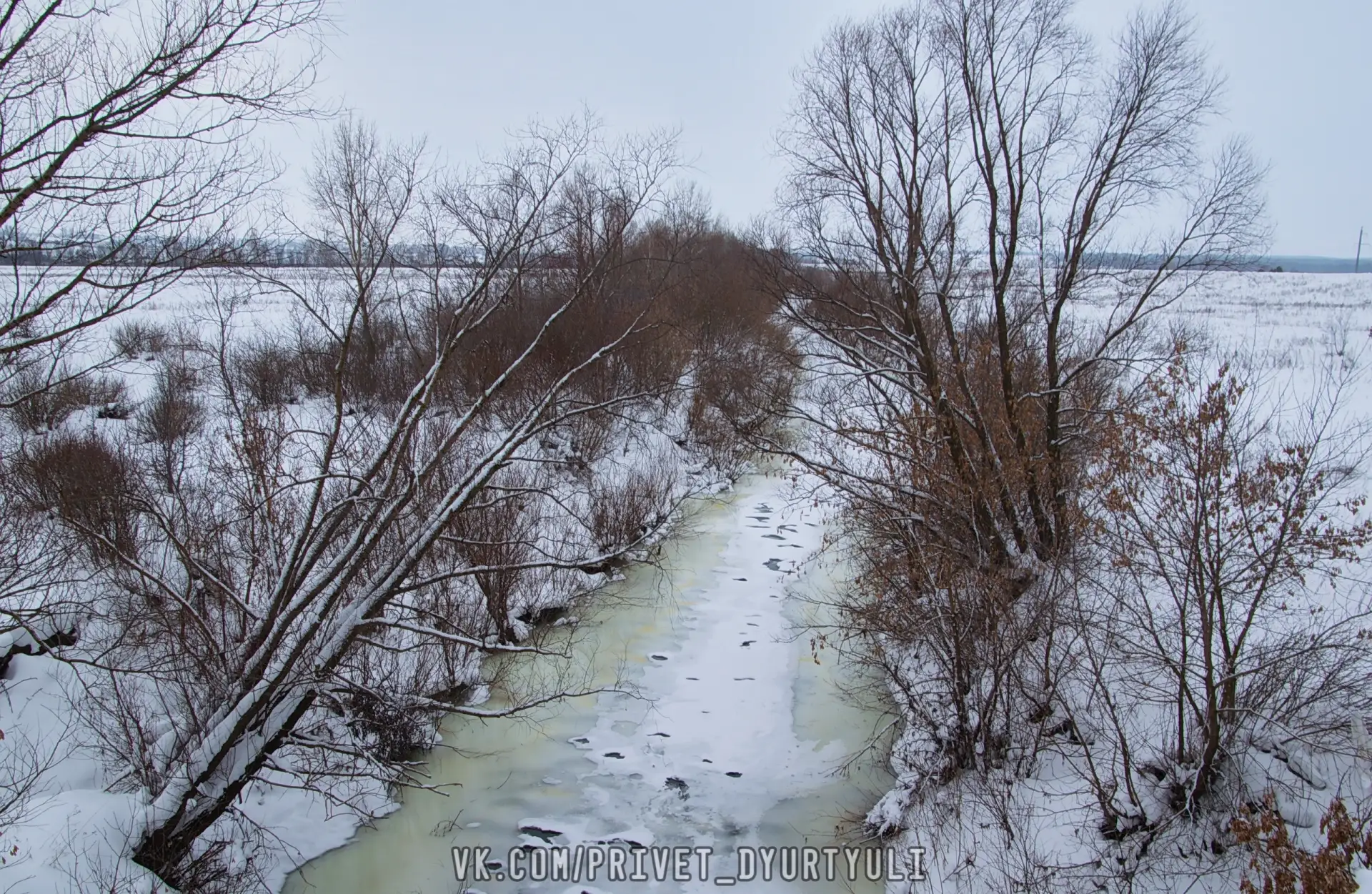 Январь. Так выглядит речка Куваш справа от Кушуля. Даже сидит одинокий рыболов, причем с уловом. Довольно крупные окуни у него.