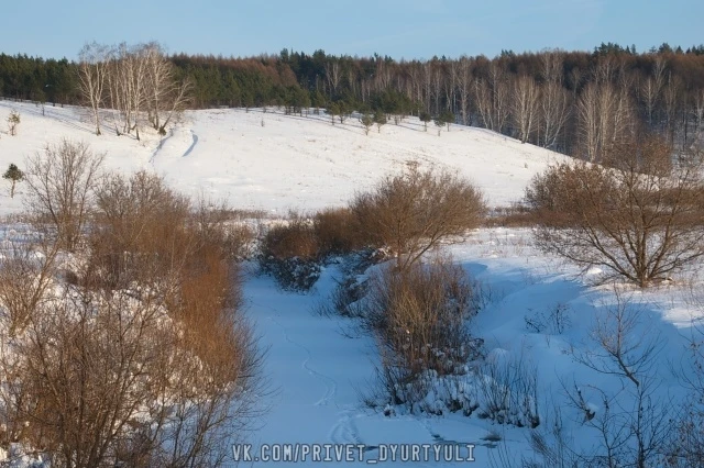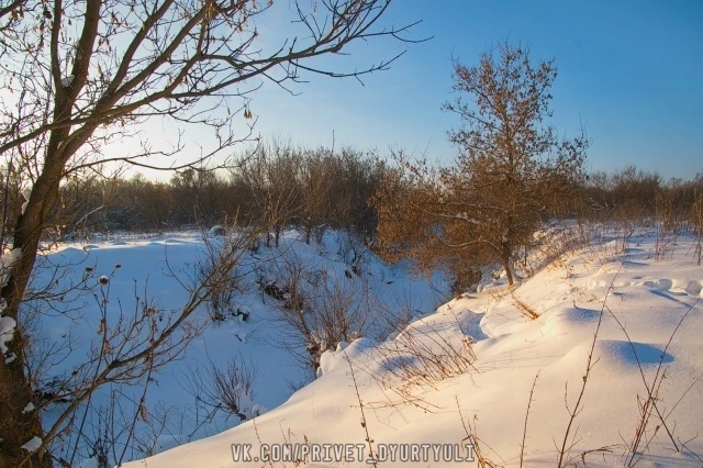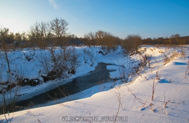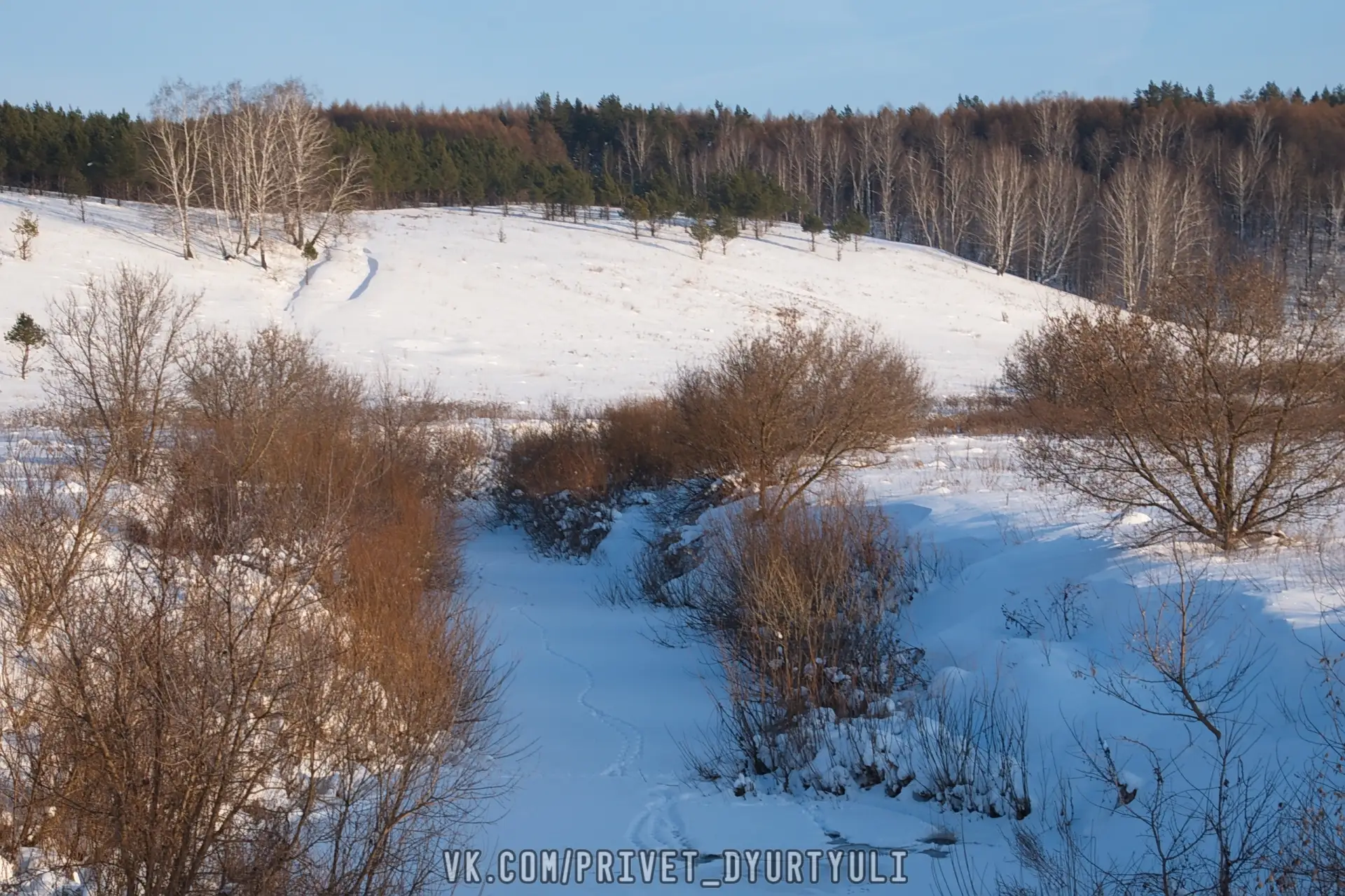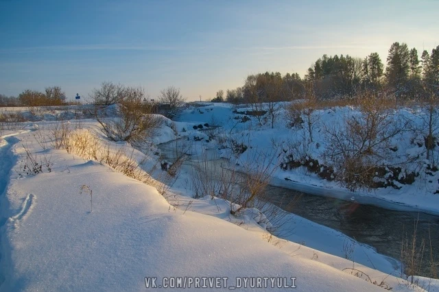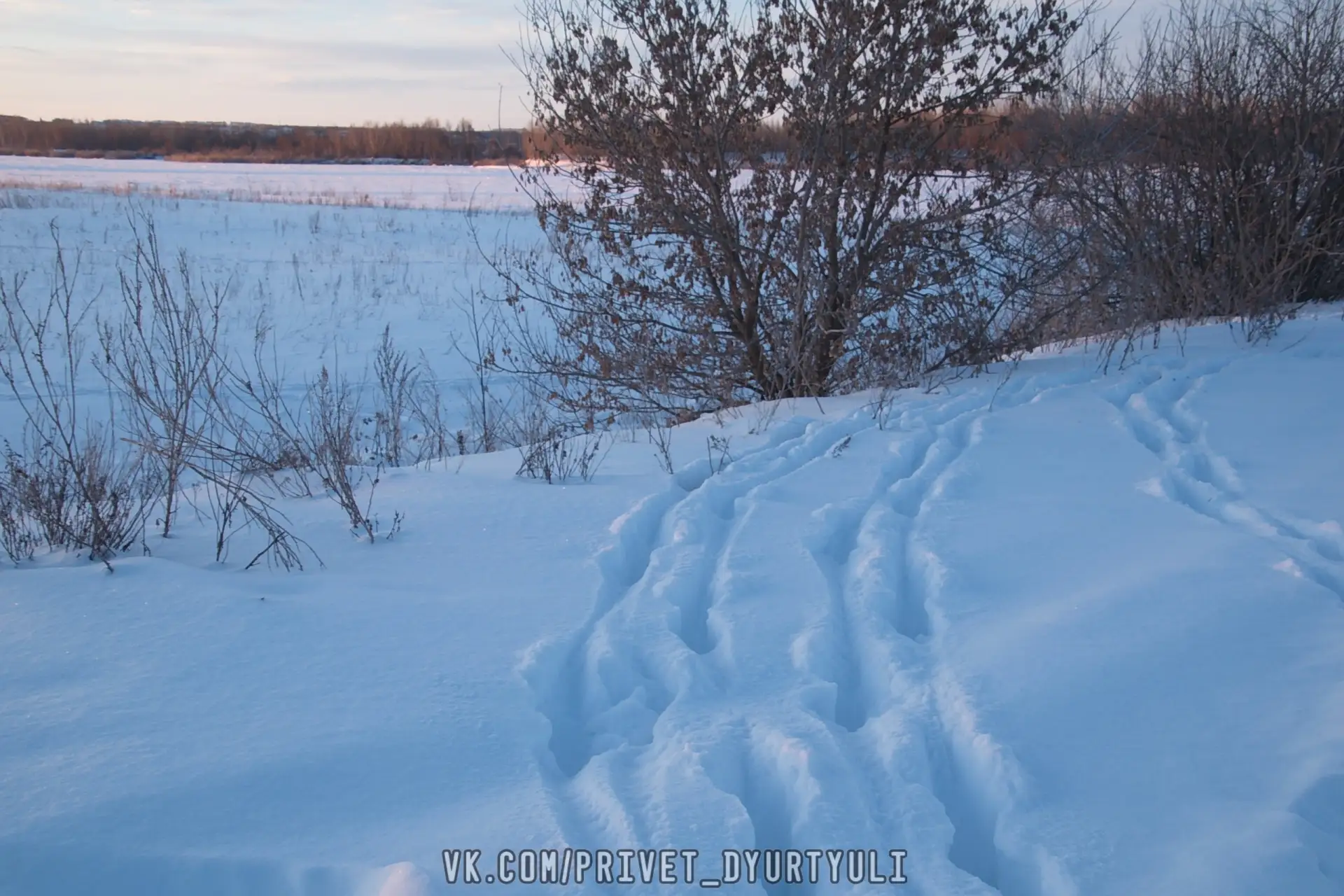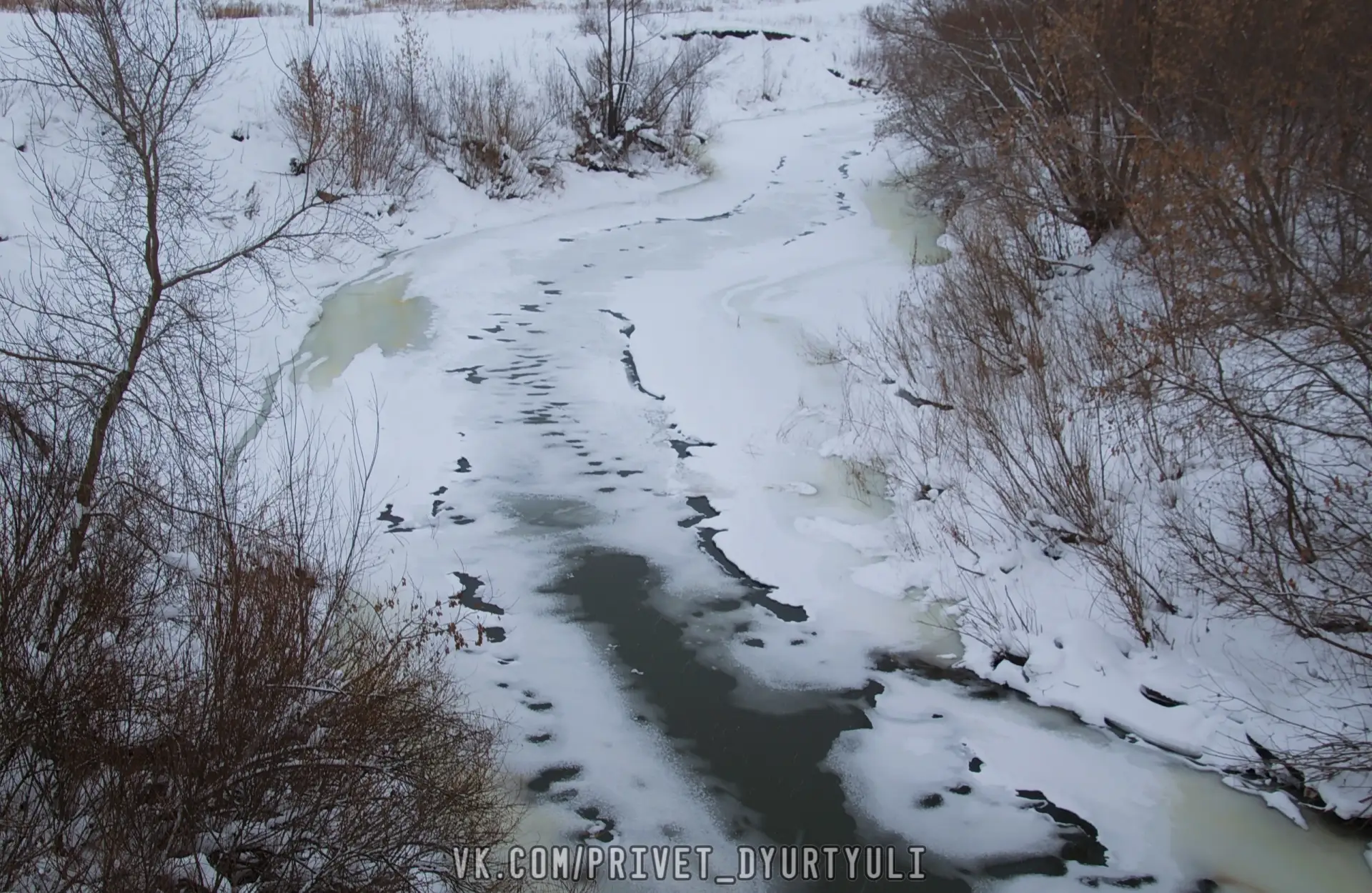 Январь. Так выглядит речка Куваш справа от Кушуля. Даже сидит одинокий рыболов, причем с уловом. Довольно крупные окуни у него.