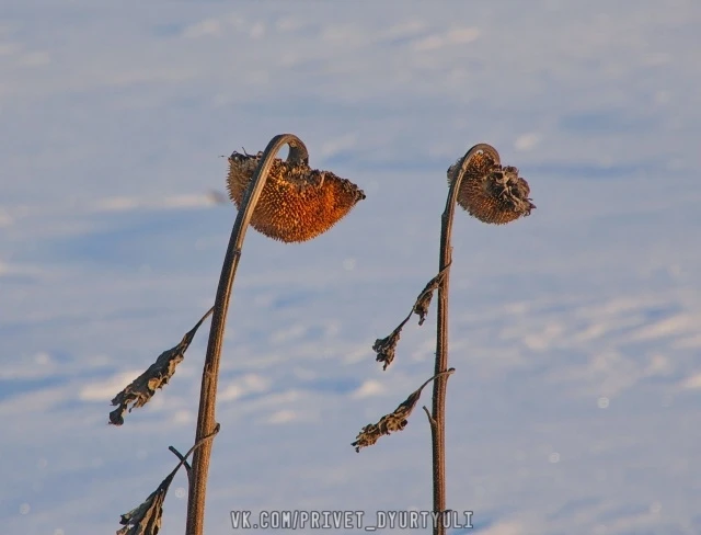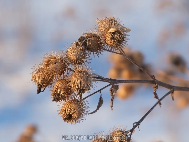 Вдоль дороги остались неубранными несколько подсолнухов. Птички уже давно воспользовались семечками — они это любят. А ещё возле дороги вырос большой куст репейника. Его шарики на страже. Кто-нибудь обязательно унесет на шкуре или на одежде один или несколько. Таким образом где-нибудь ещё вырастет новый куст))) Так он (репейник) размножается.