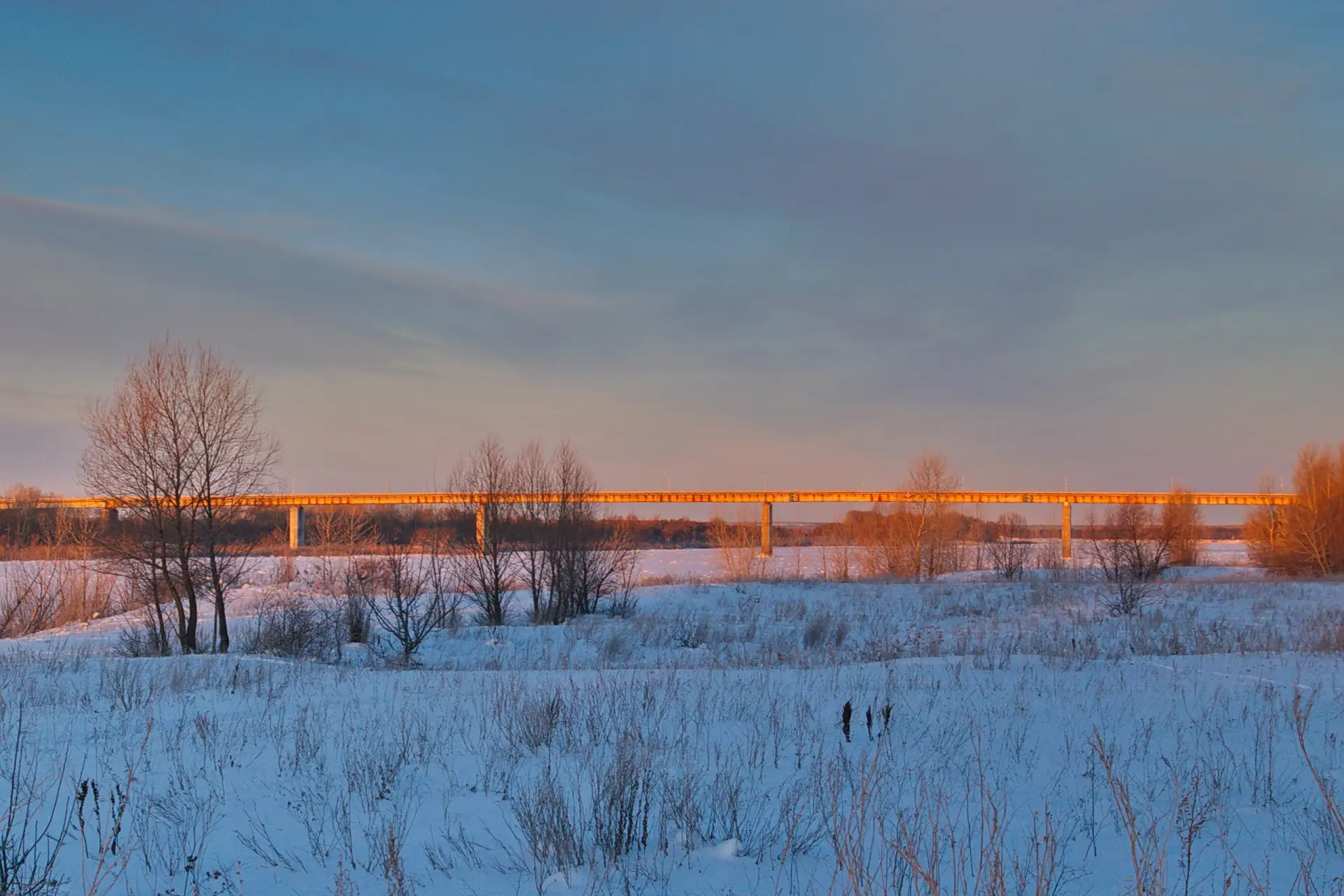 🌡️Морозное утро января. Восход. Солнце нестерпимо яркое, вон как осветило мост и город. Превосходная погода!