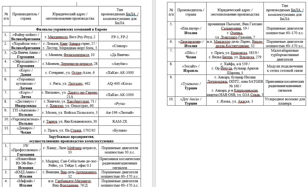 Министерство «обнародовало названия и адреса филиалов украинских предприятий в Европе, где производят БПЛА для ударов по России».