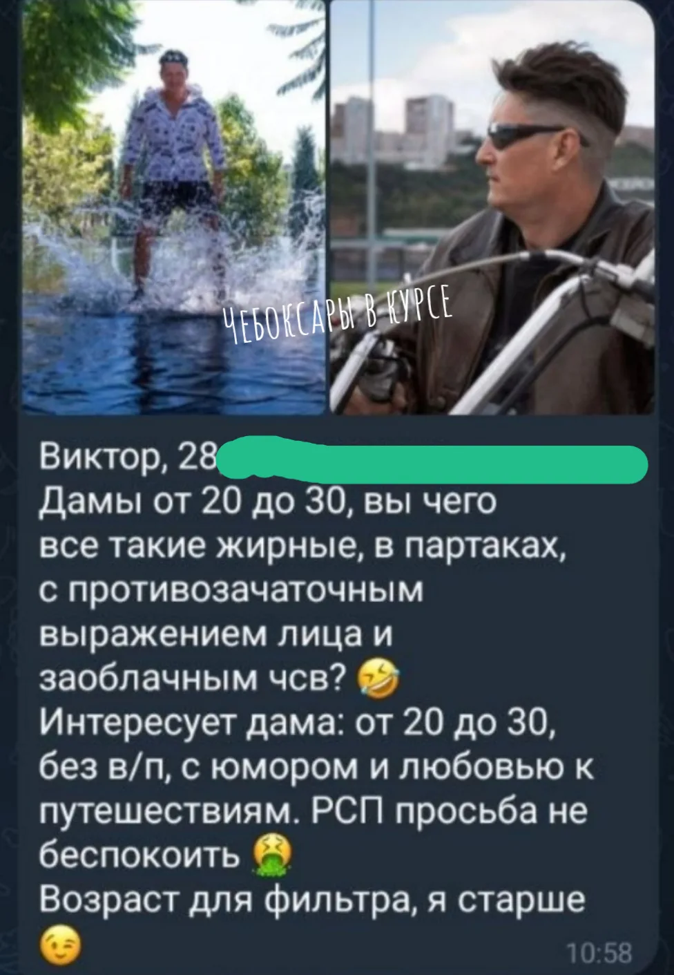 💁♀️"Добрый день. Мне одной кажется или в Чебоксарах мужчины все наглеют и хамеют с каждым годом? Ладно запросы свои ставишь, но зачем оскорблять женщин? Кто право дал РСП всех называть? Мразь одним словом! Анонимно пожалуста"