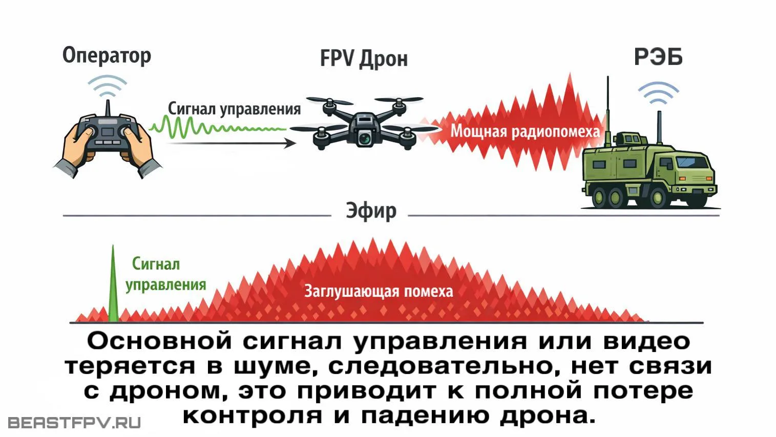 ⚙️ FPV-дрон использует компактные антенны и ограниченную мощность, не имея резервных каналов связи. РЭБ же работает высокой мощностью, создавая условия, при которых борт просто не может «услышать» пилота.