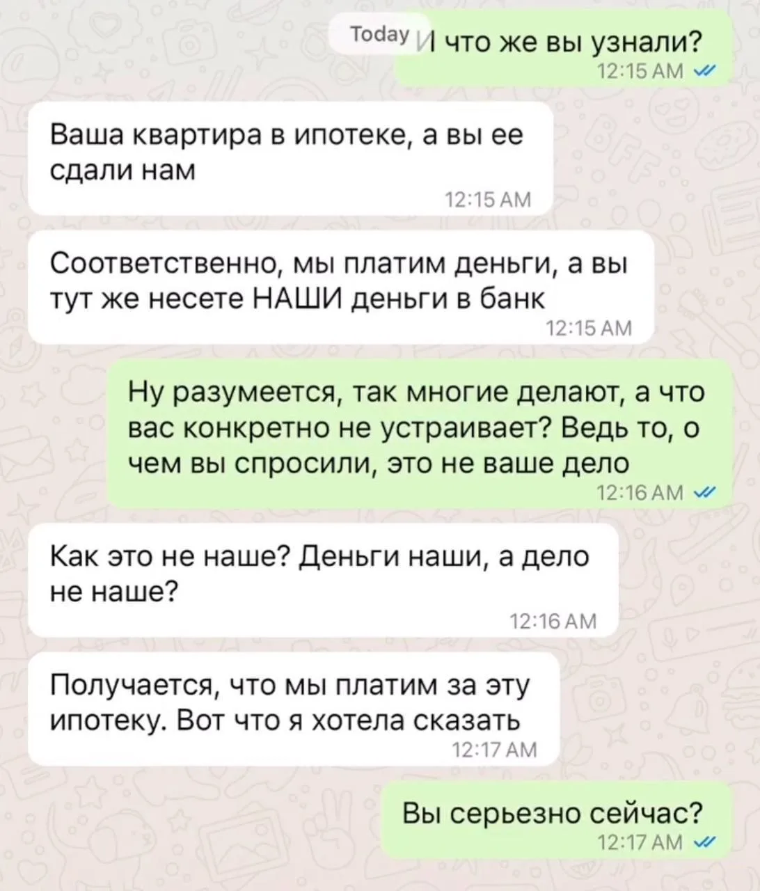 🏠 Арендаторы обвинили владельца квартиры в том, что он тратит деньги от аренды на выплату ипотеки.