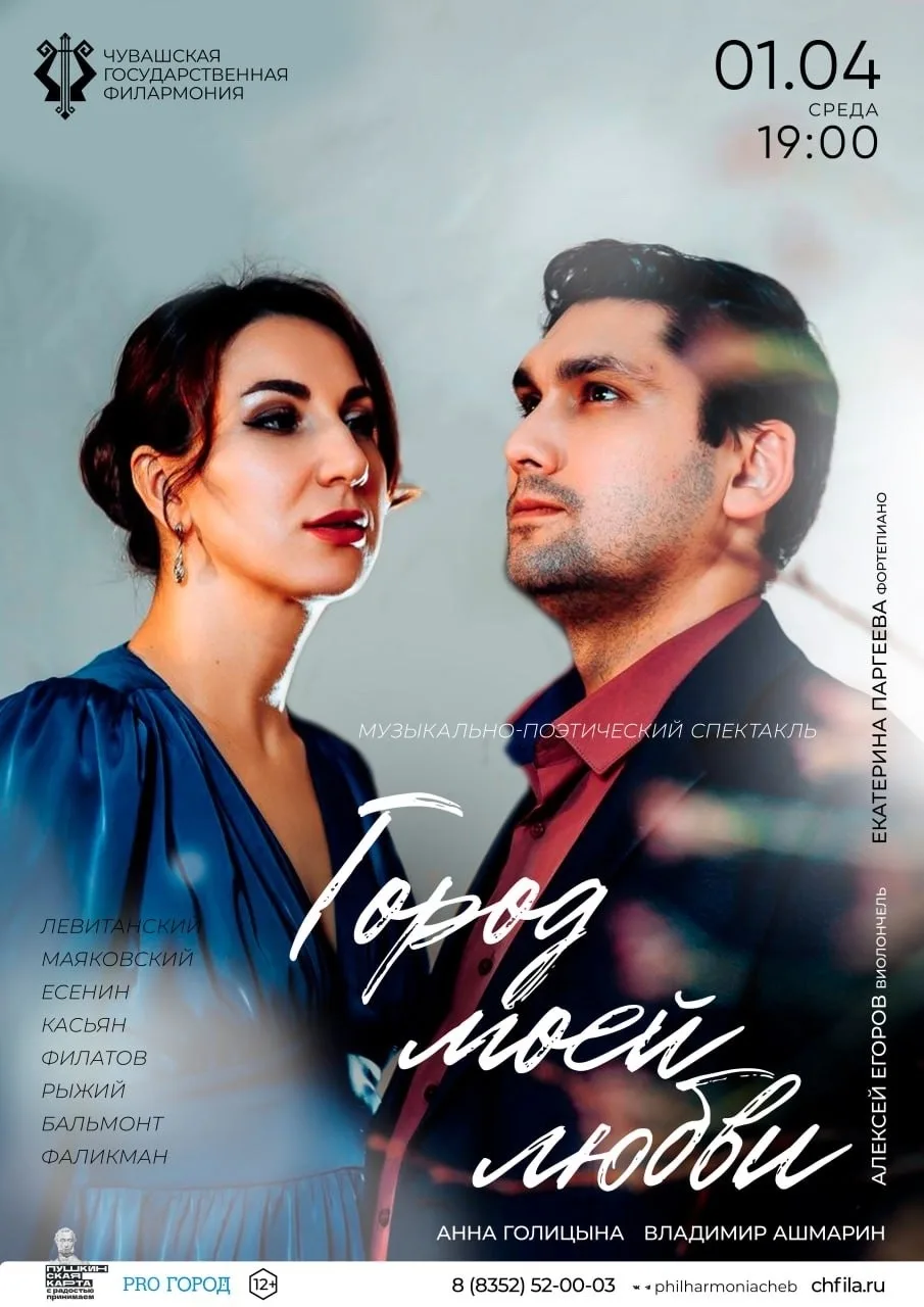 1 апреля, в 14:00, Чувашская государственная филармония представит публике совершенно новое музыкально-поэтическое представление под названием «Город моей любви». На сцену выйдут талантливые артисты: Анна Голицына, Владимир Ашмарин и Екатерина Паргеева, которая аккомпанирует на рояле, а также виолончелист Алексей Егоров.