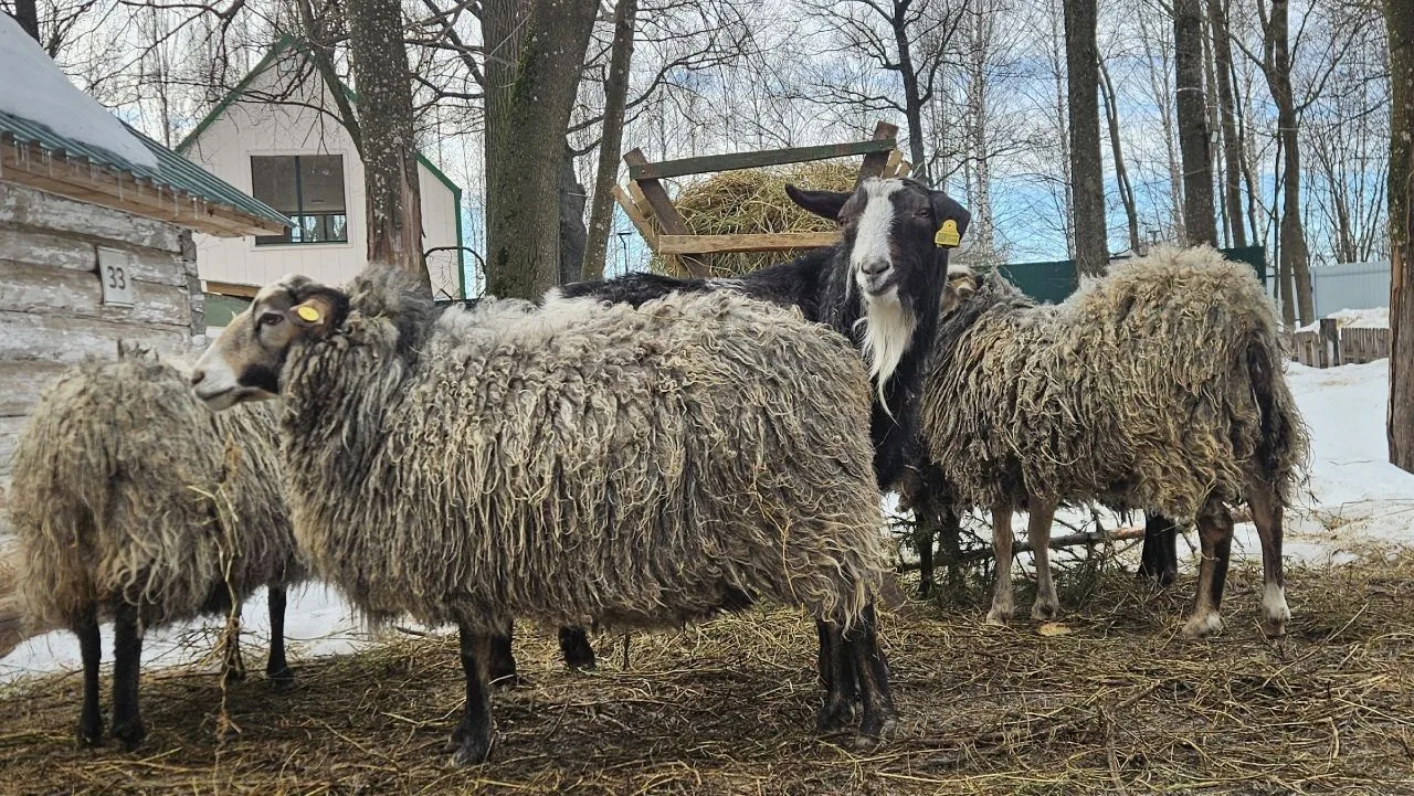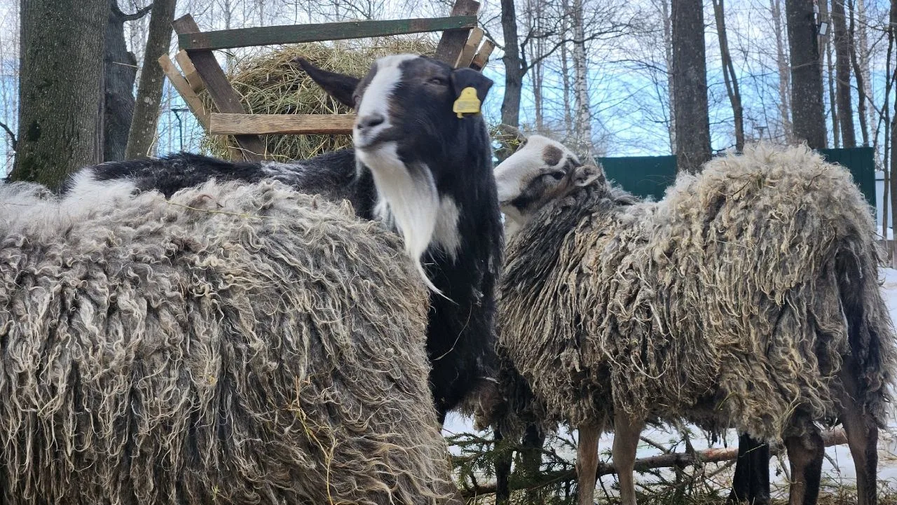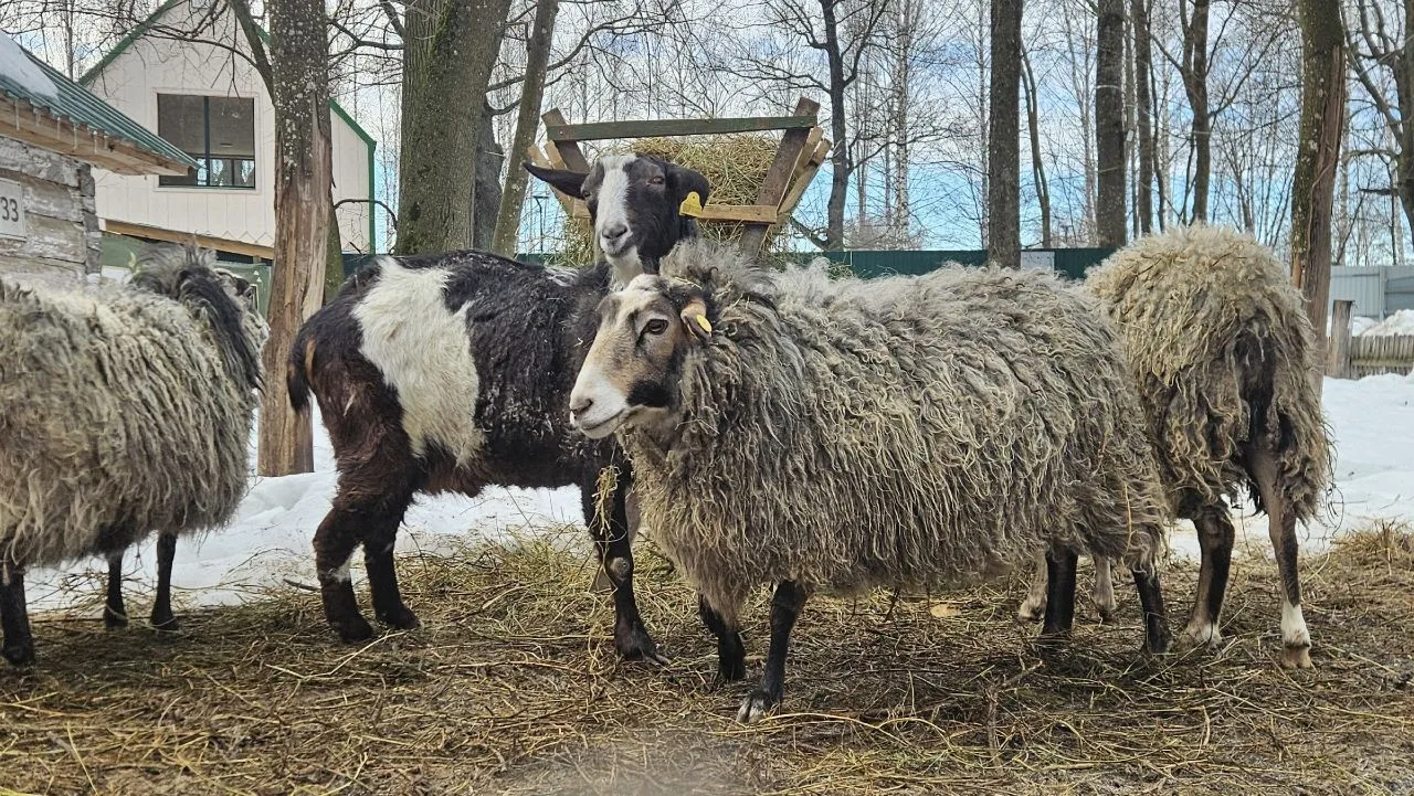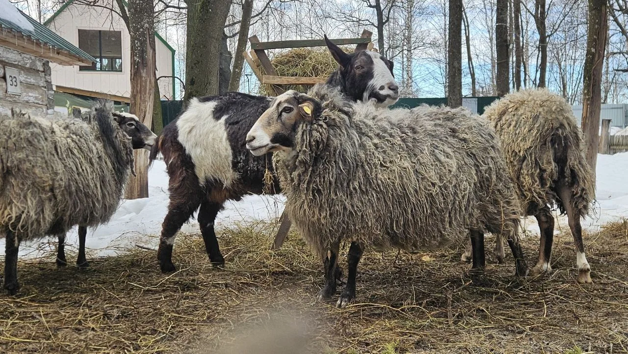 Мы, овечки романовской породы, и наш приятель-козленок, испытываем сегодня невероятную радость! 🌞 День выдался таким ясным и ласковым, что наша овечья шерсть словно стала невесомее, а настроение — выше облаков!