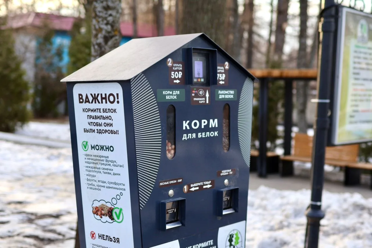 Для удобства посетителей на территории парка установлены автоматы, предлагающие лесные и кедровые орехи – идеальное лакомство для наших рыжих друзей. Оплату можно произвести банковской картой, что делает процесс покупки максимально простым и удобным – наличные вам не потребуются.