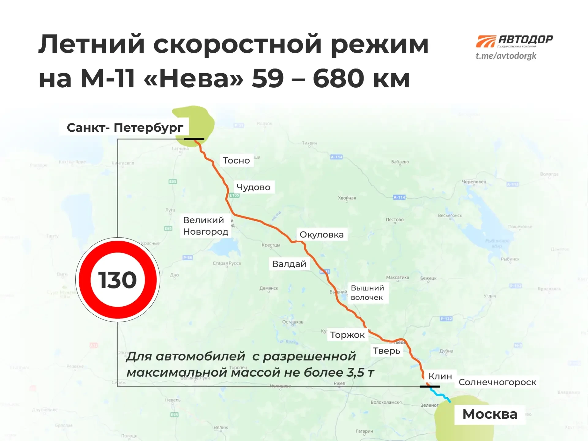 🔹 На М-11 «Нева» от 59 км до Санкт-Петербурга — до 130 км/ч