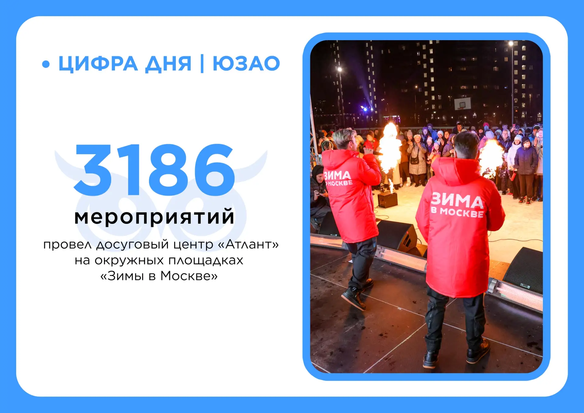 Проект «Зима в Москве» в ЮЗАО бьет рекорды по вовлеченности! С начала сезона досуговый центр «Атлант» организовал на окружных площадках 3 186 мероприятий, которые посетили 102 299 человек. Это доказывает: юго-запад Москвы — территория активного и культурного отдыха.