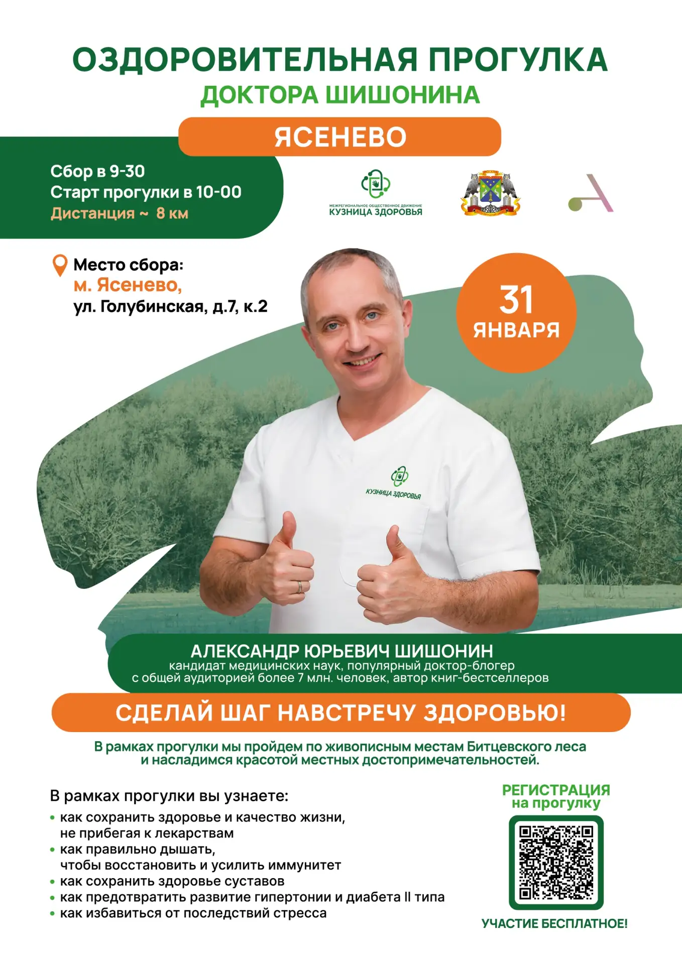 31 января 2026 года приглашаем на оздоровительную прогулку по живописным местам Битцевского леса. Это отличная возможность совместить активный отдых с получением полезных знаний о поддержании здоровья.