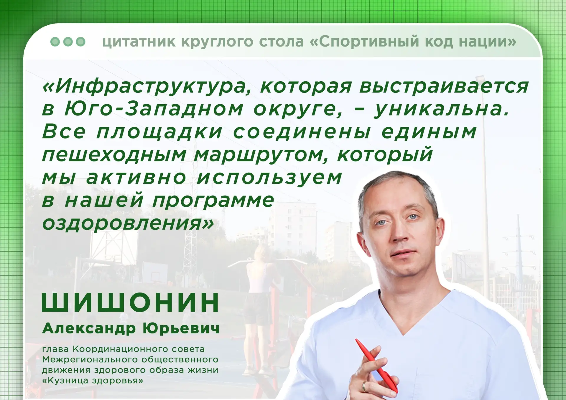 Александр Шишонин, глава Координационного совета Межрегионального общественного движения «Кузница здоровья», отметил уникальность спортивной инфраструктуры Юго-Западного округа. Все площадки соединены единым пешеходным маршрутом, который активно используется в программе оздоровления.