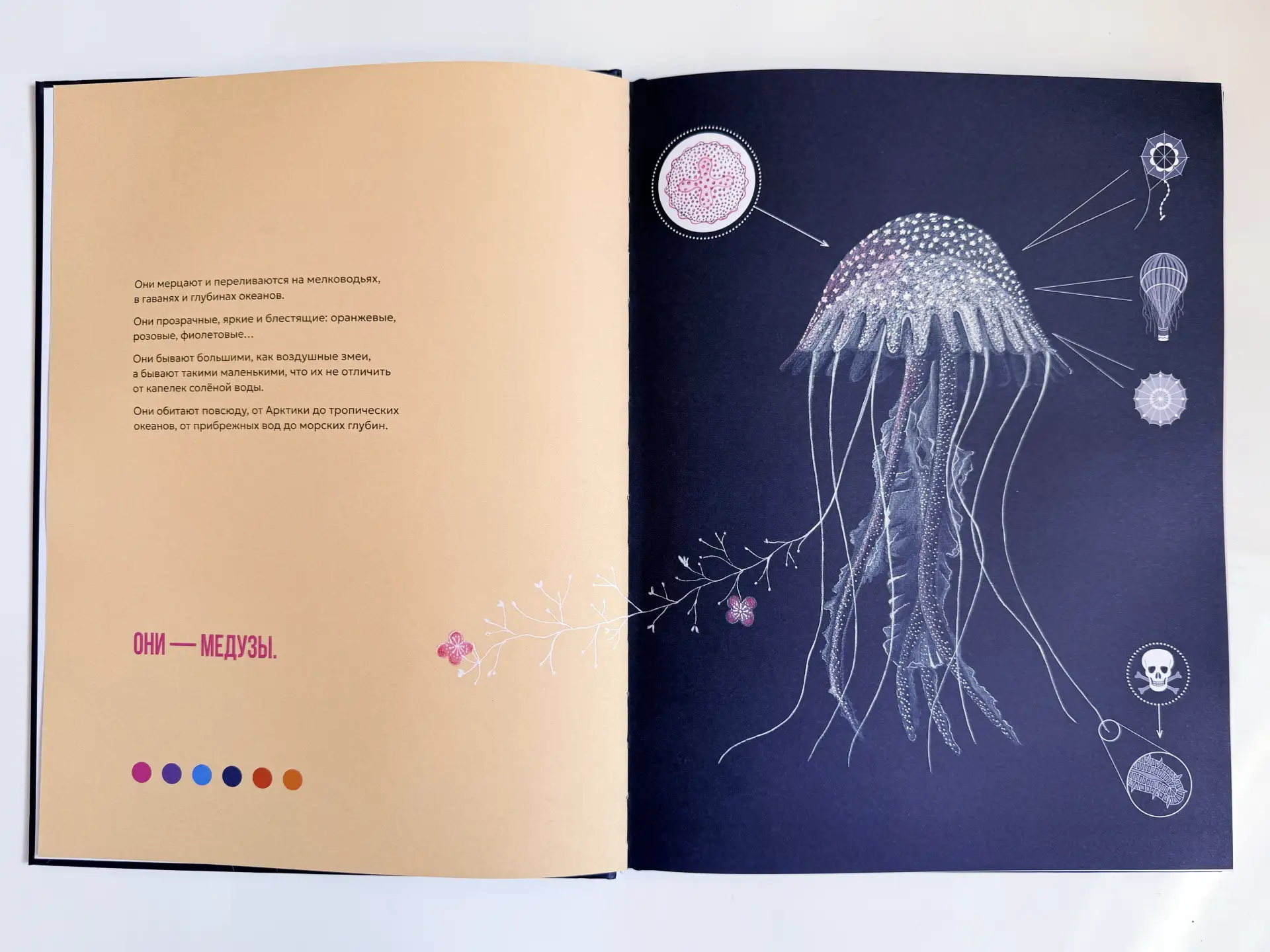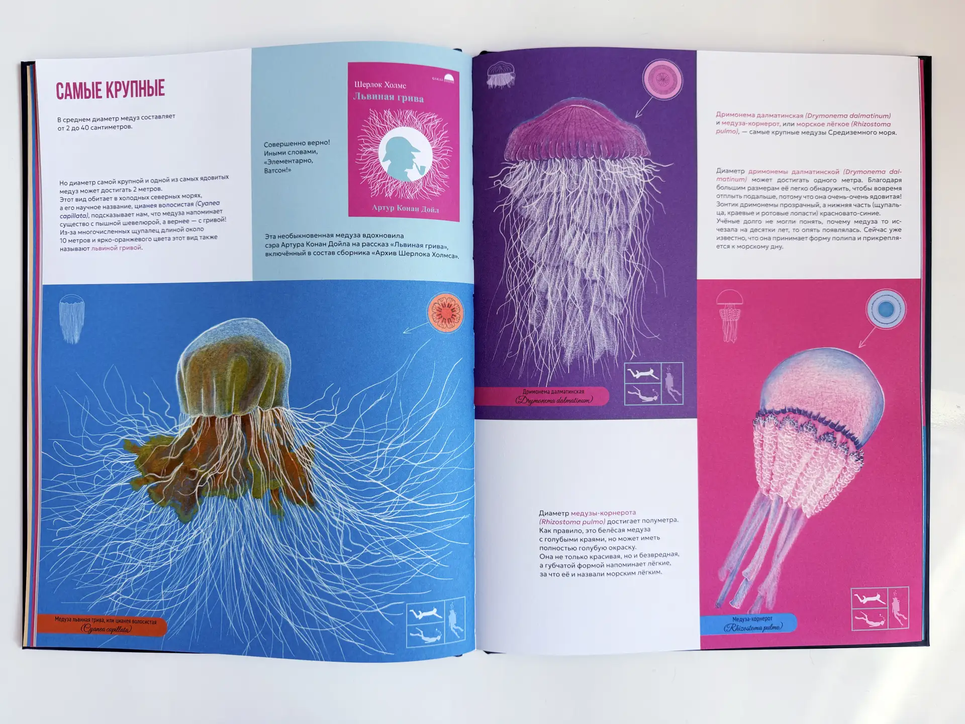 Энциклопедию «Сад медуз» написала доктор биологических наук Паола Витале, а проиллюстрировала итальянская художница Россана Боссу. В ней есть ответы на все возможные вопросы о медузах — от строения до самых неожиданных фактов.