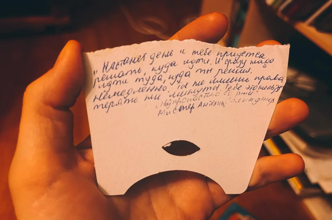 Искала на даче на полках одну книжку и откуда-то сверху на меня упала картонка, оторванная от коробки конфет, а на ней — цитата. Явно я писала, узнаю корявый почерк.