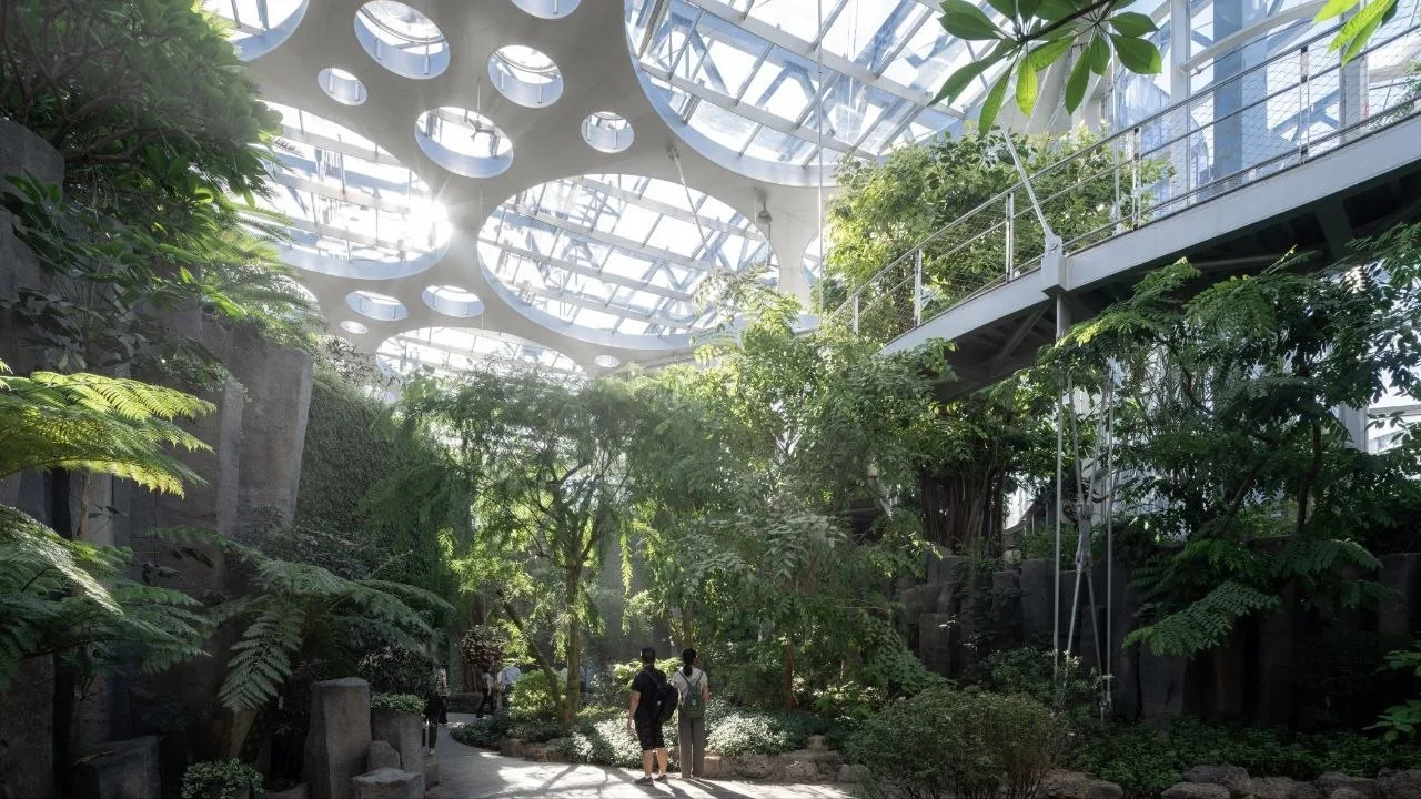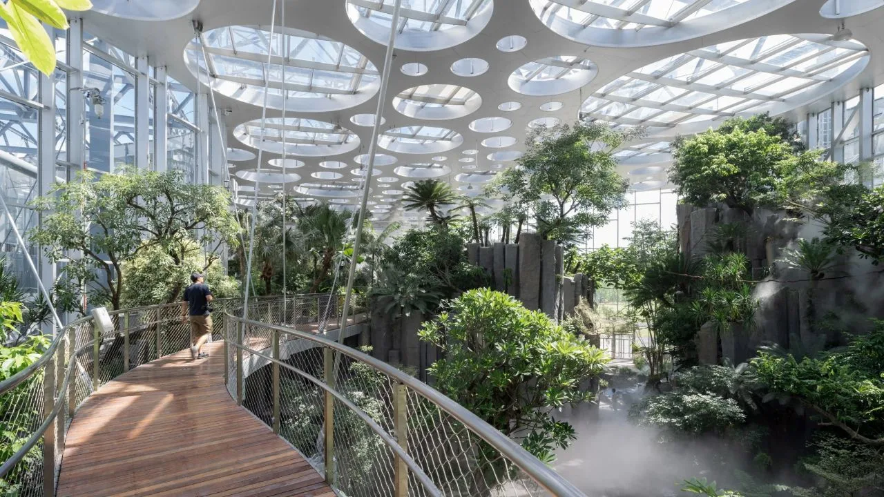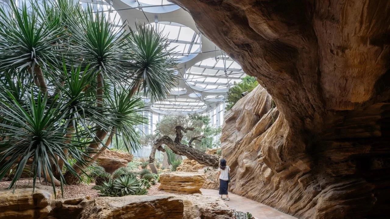 🌴 Комплекс включает несколько павильонов с разными климатическими сценариями: от пустынных ландшафтов с дюнами до тропического леса с водопадами и цветочных садов. Пространства дополняются естественной вентиляцией и продуманной экосистемой внутри.