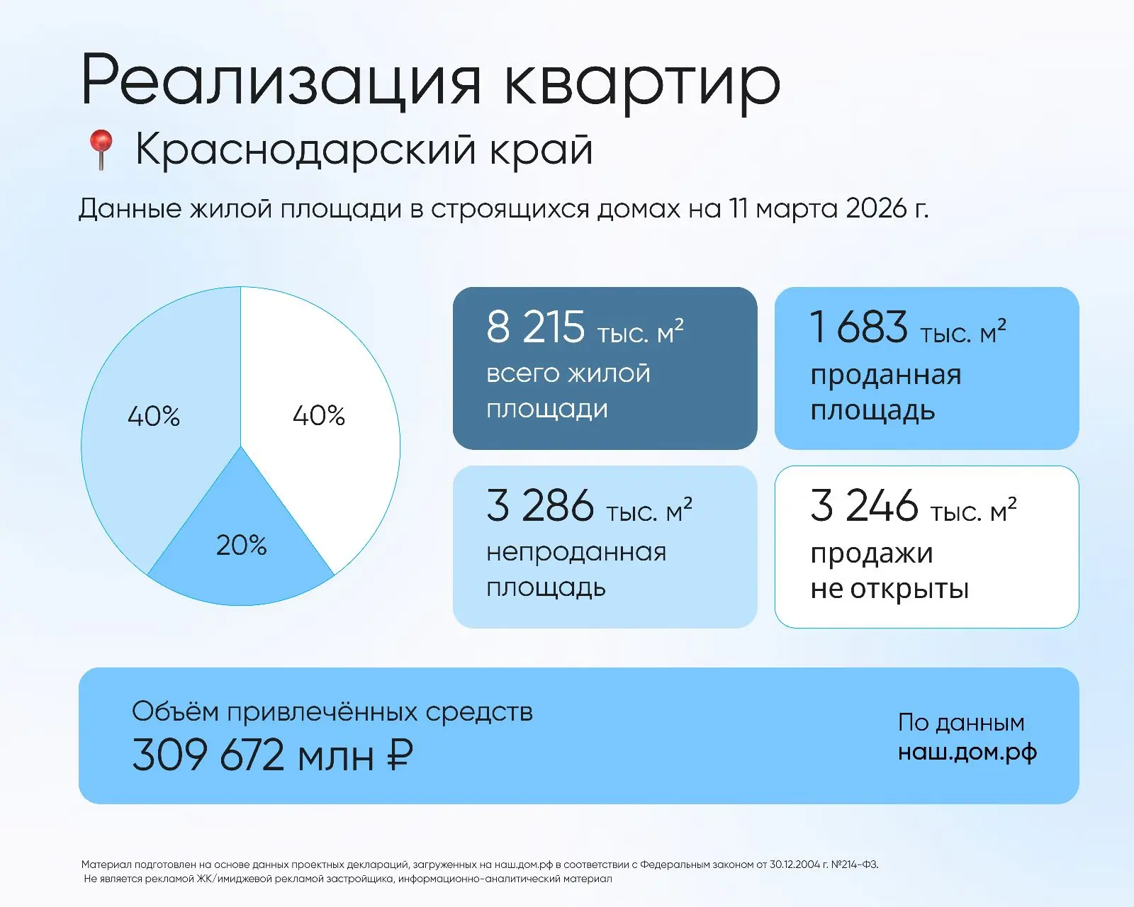 В Краснодарском крае жилая площадь в строящихся домах на 11 марта составляет 8 215 тыс. м2, из них 20% уже реализовано. На диаграмме изображено соотношение проданной и непроданной площади, а также площади жилых помещений, продажи которых не открыты.