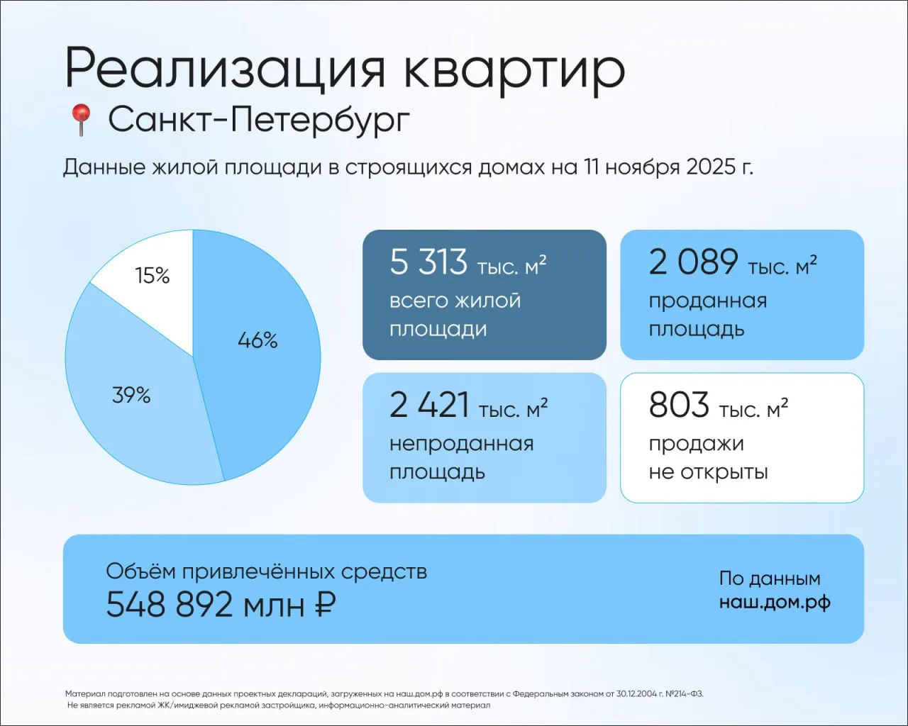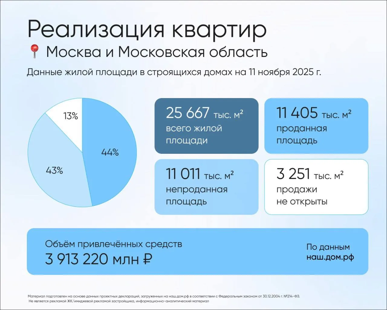 В Москве и Московской области жилая площадь в строящихся домах на 11 ноября составляет 25 667 тыс. м2 , из них 44% уже реализовано.