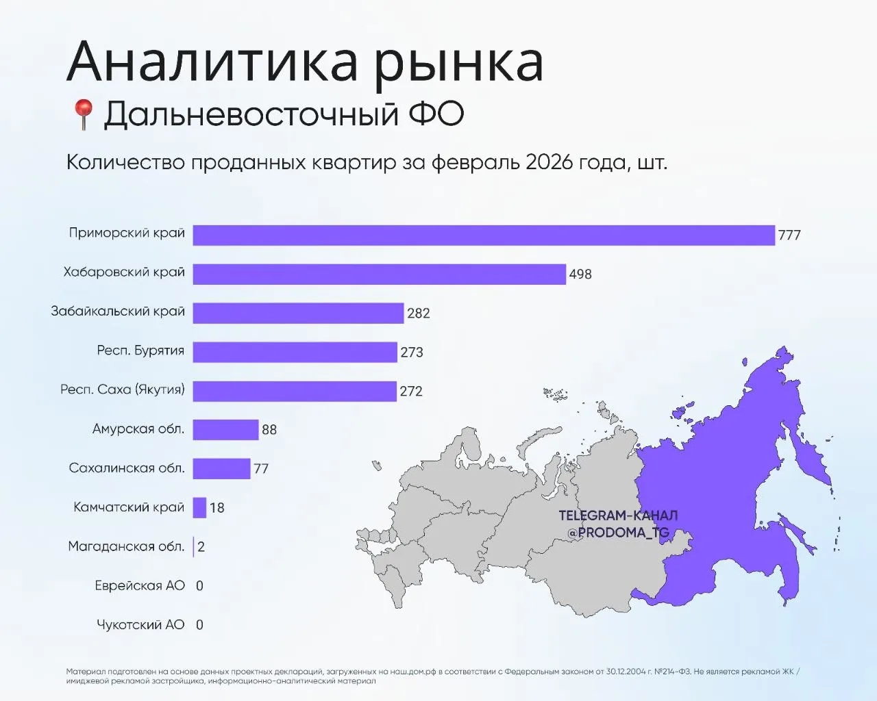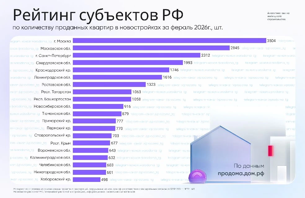 Представляем рейтинг субъектов Российской Федерации по количеству проданных квартир в новостройках за февраль 2026 г.