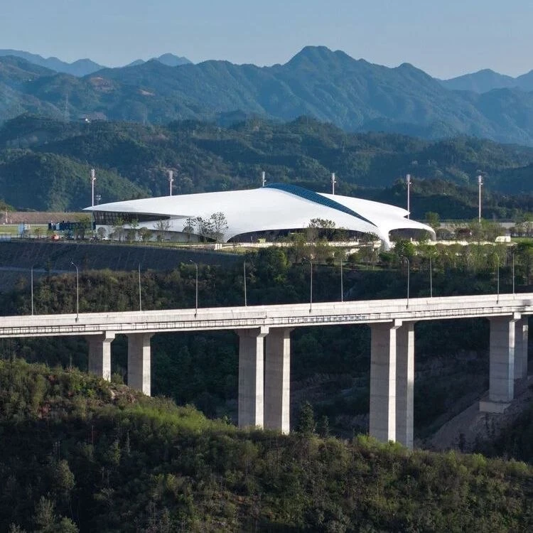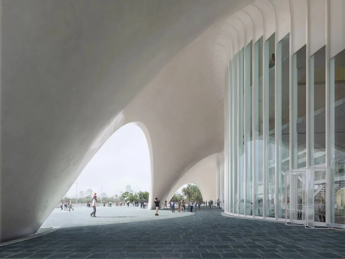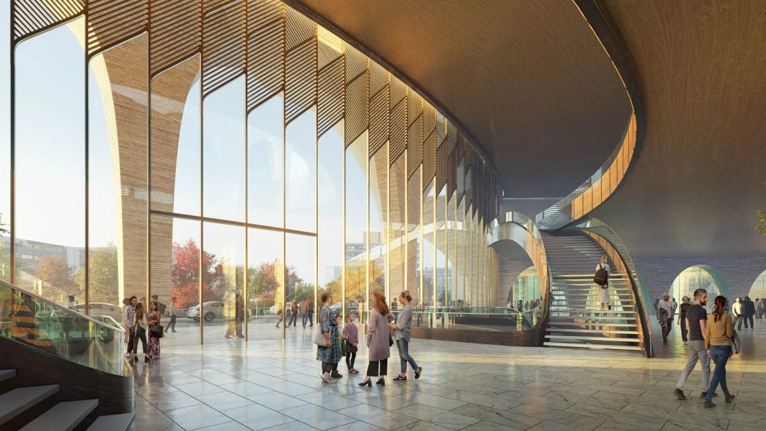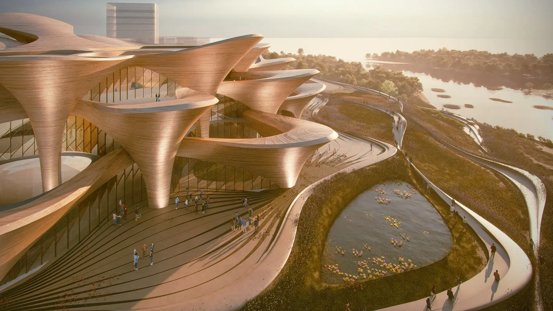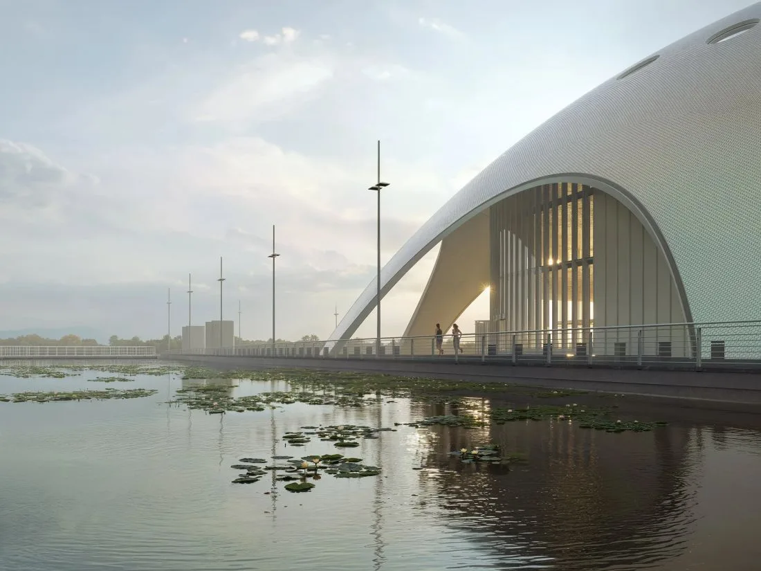 Архитекторы сохранили элементы старой инфраструктуры и встроили в неё футуристичные стеклянные павильоны. Изогнутые формы и металлическая решётка формируют выразительный силуэт, который «растёт» из индустриального прошлого территории.