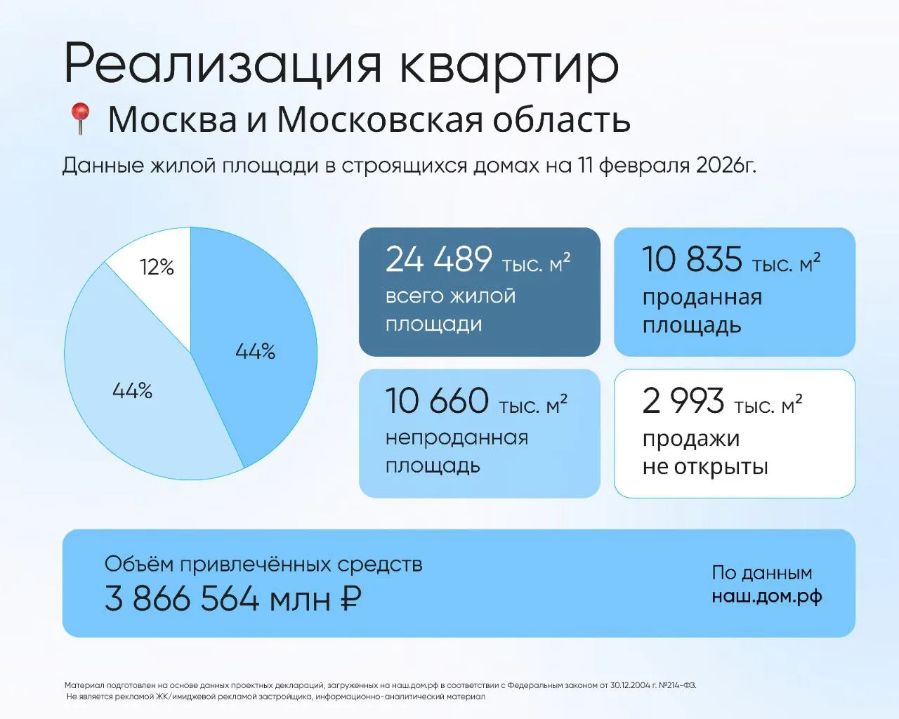 В Москве и Московской области жилая площадь в строящихся домах на 11 февраля составляет 24 489 тыс. м2, из них 44% уже реализовано. На диаграмме изображено соотношение проданной и непроданной площади, а также площади жилых помещений, продажи которых не открыты.