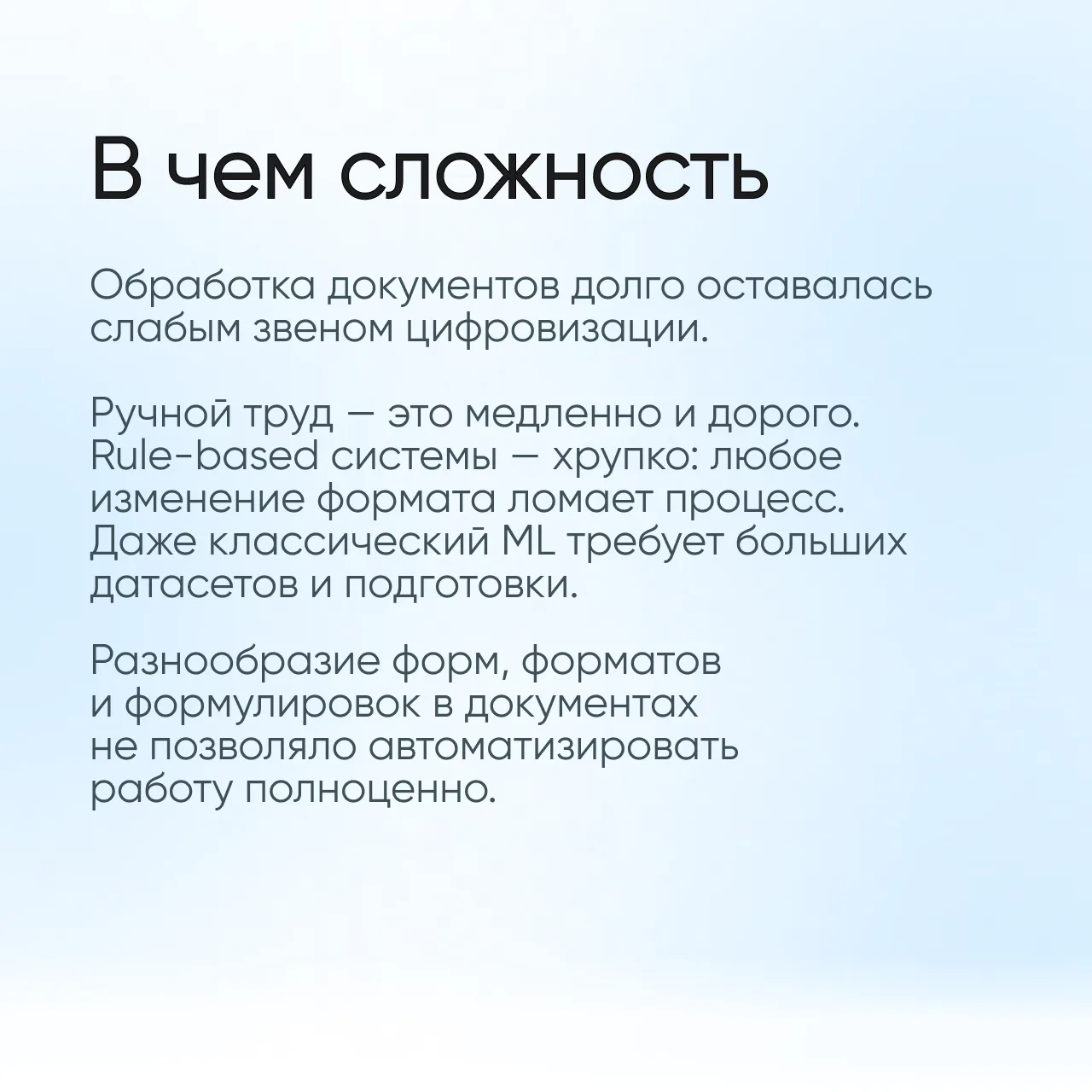 Обработка документов долго оставалась узким местом цифровизации: ручной ввод данных, нестабильные rule-based решения и ограничения классических моделей не позволяли выстроить по-настоящему сквозной процесс.