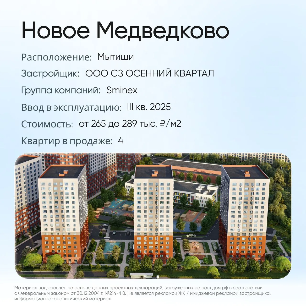 🔸Новое Медведково — 4 квартиры | от 265 до 289 тыс. ₽/м2