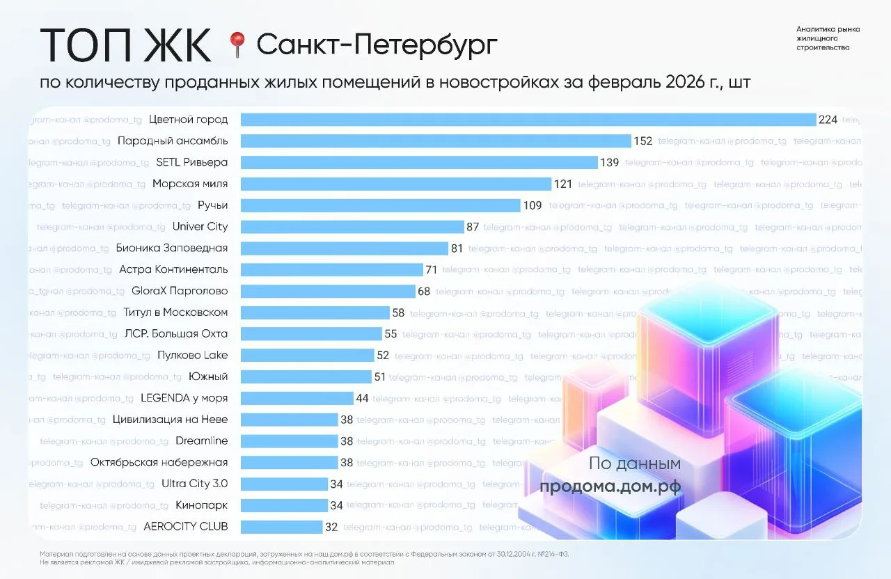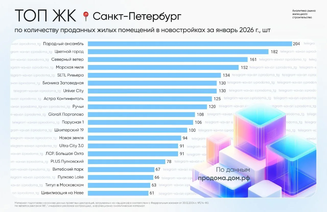 Представляем рейтинг жилых комплексов Санкт-Петербурга по количеству проданных квартир в новостройках за январь 2026 г.