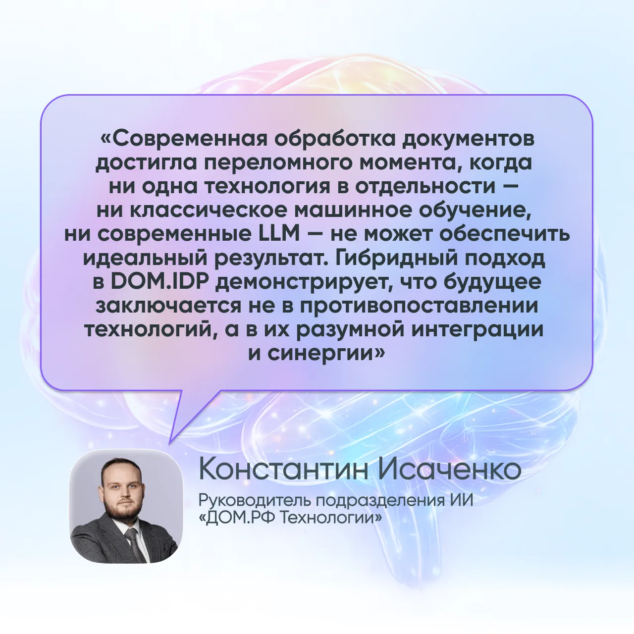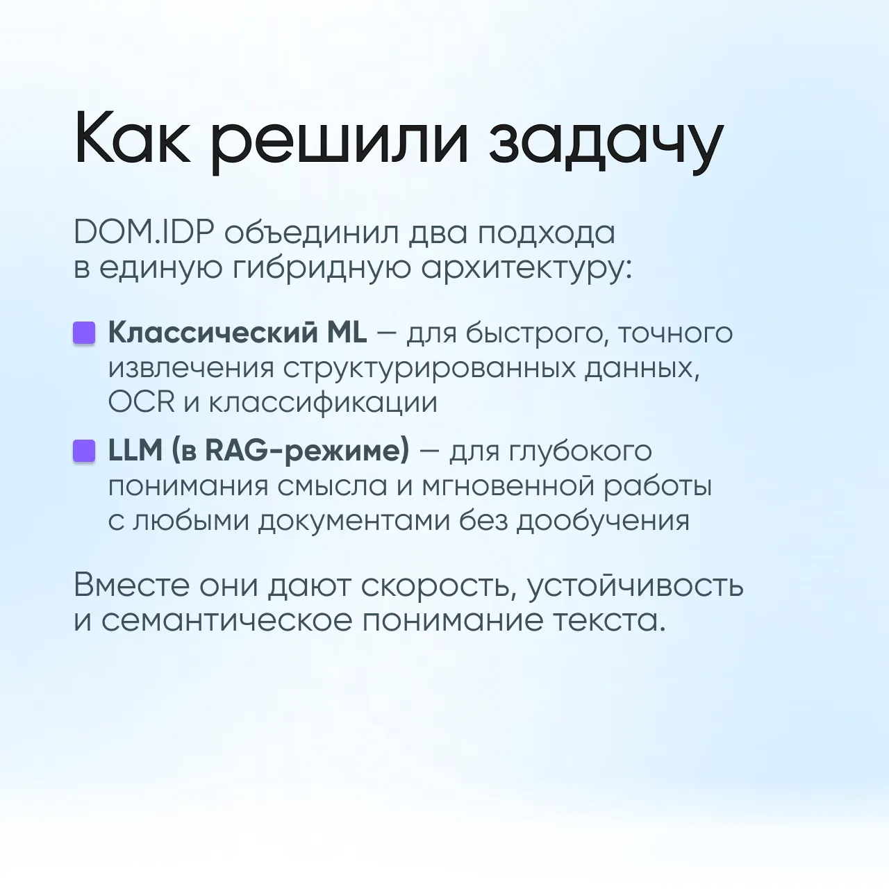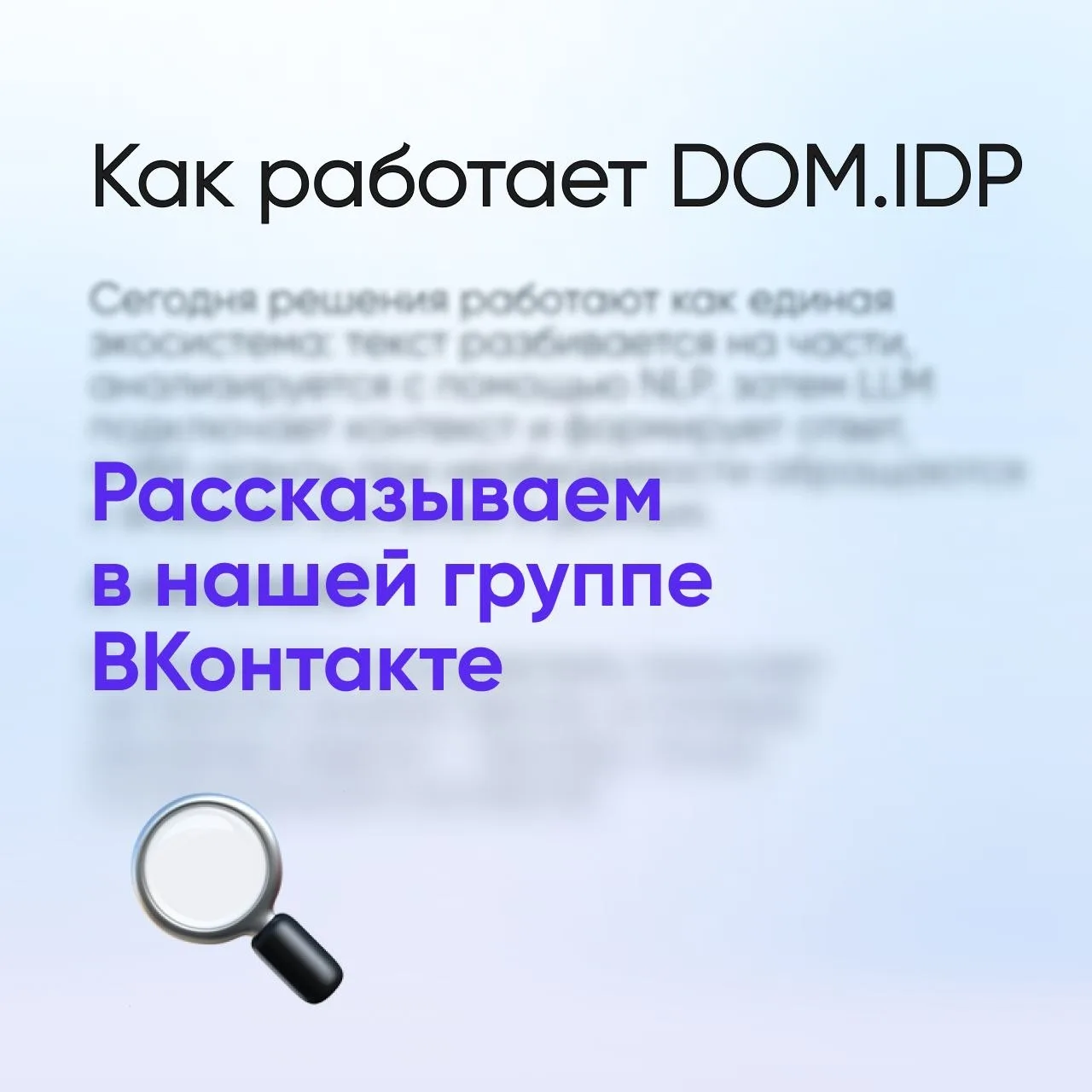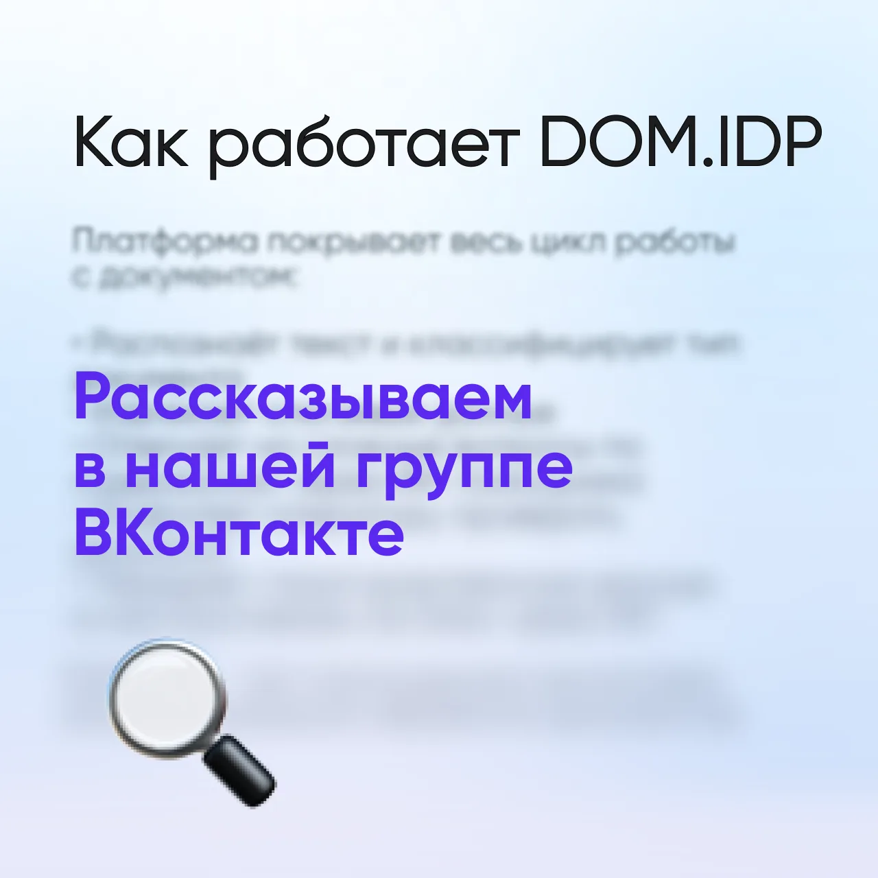 DOM.IDP объединил в себе классический ML и современные LLM, чтобы автоматизировать извлечение данных, анализировать сложные договоры и ускорять работу с документами без потери точности. Переходите в нашу группу ВКонтакте, чтобы увидеть материал целиком и узнать, как работает эта платформа.