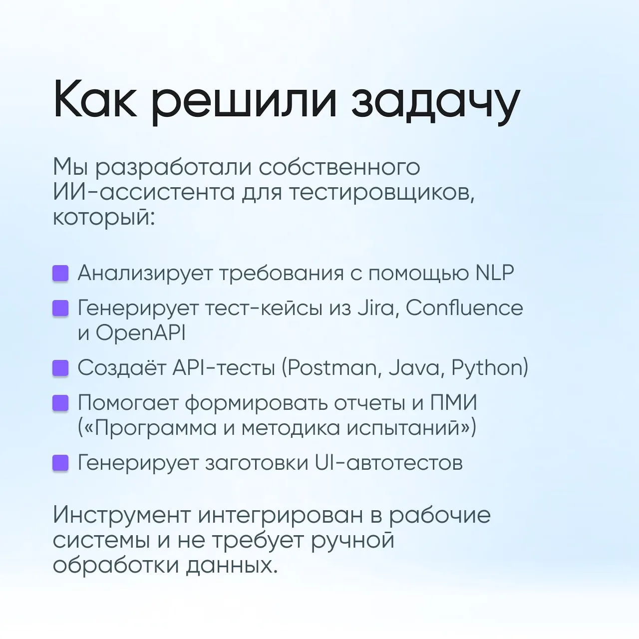В этот раз разобрались, как появился «Ассистент тестировщика»: какие задачи он взял на себя, почему готовые GPT-решения не подошли и как ИИ помог сократить время на рутинные операции.