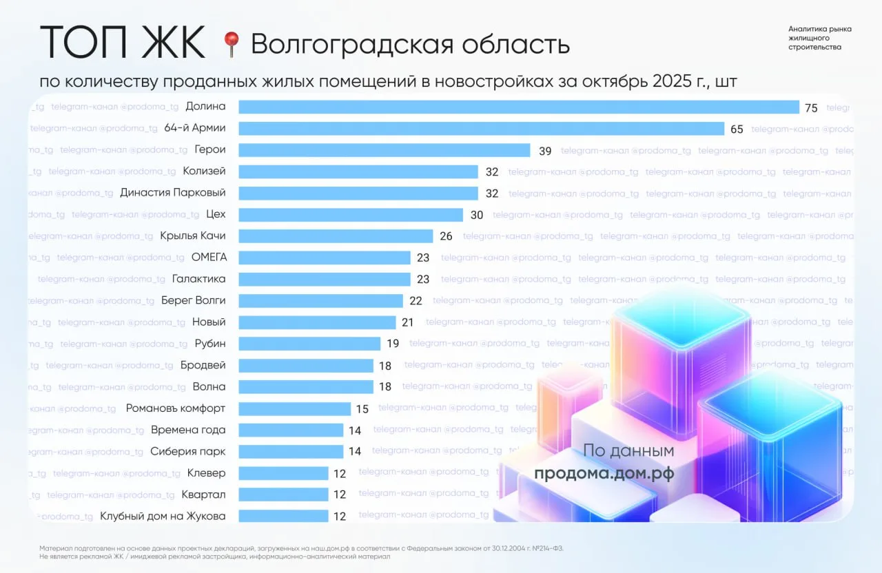 Представляем рейтинг жилых комплексов Волгоградской области по количеству проданных квартир в новостройках за октябрь 2025 г.