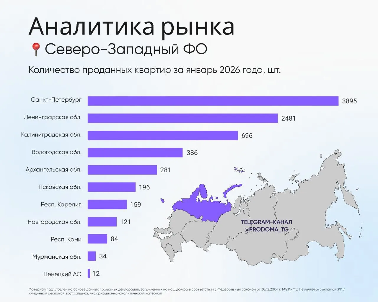 📈 Представляем рейтинг субъектов Северо-Западного федерального округа по количеству проданных квартир в новостройках за январь 2026 года.