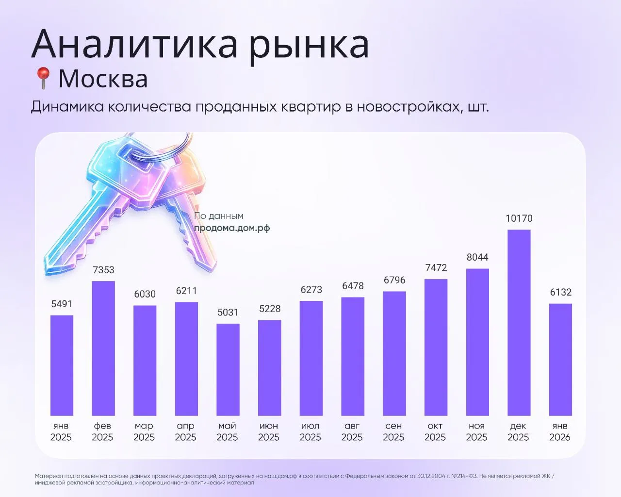 Публикуем динамику количества проданных квартир в новостройках Москвы с января 2025 по январь 2026 г.