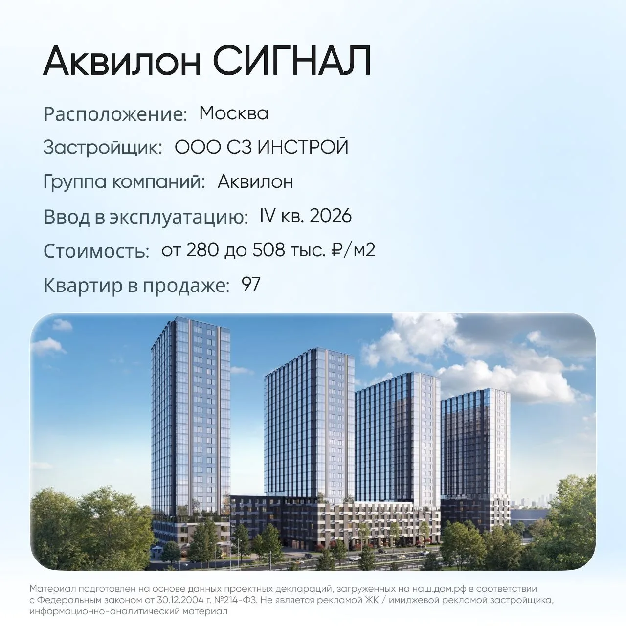 🔸Аквилон СИГНАЛ — 97 квартир | от 280 до 508 тыс. ₽/м2