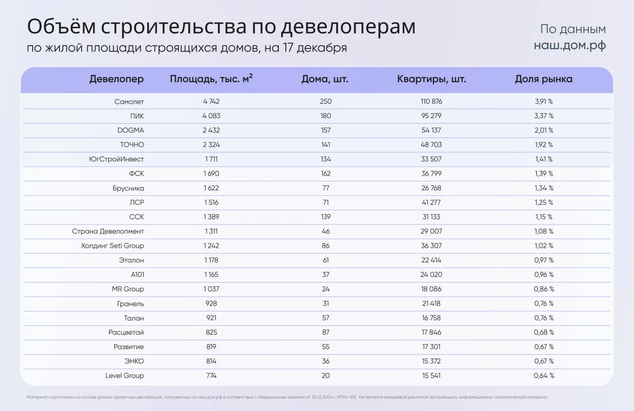 Представляем аналитику объёма строительства в разбивке по девелоперам. Рейтинг застройщиков России составлен по площади строительства на 17 декабря 2025 г.