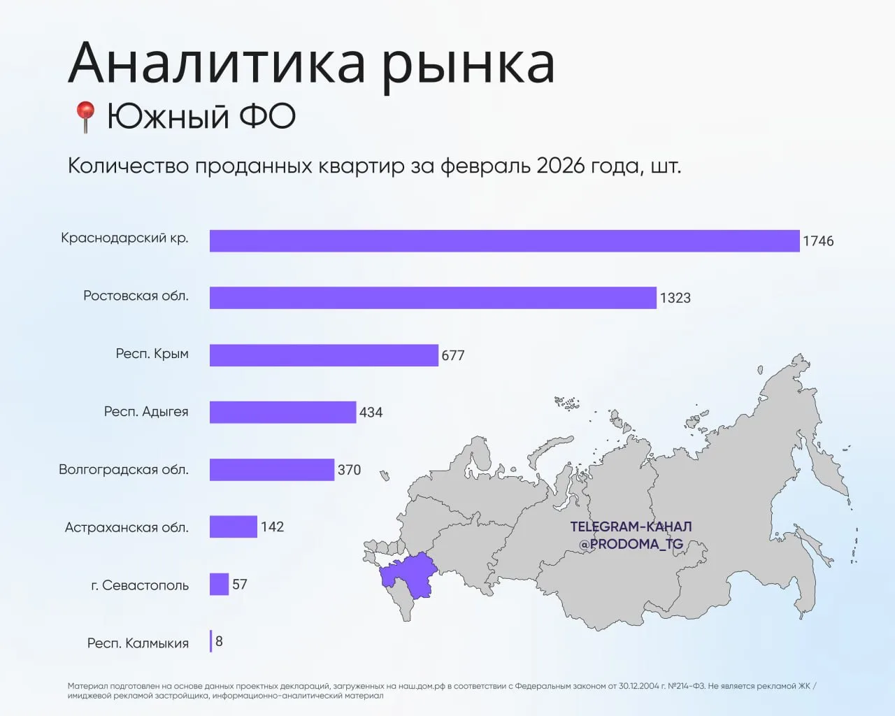 📊 Представляем рейтинг субъектов Южного федерального округа по количеству проданных квартир в новостройках за февраль 2026 года.