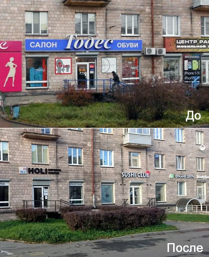 На фотографии показан дом ДО и ПОСЛЕ введения дизайн-кода в городе. Если совсем коротко, то чтобы города не выглядели уродливо, надо перестать вставлять большие цветные пятна туда, где им не место.