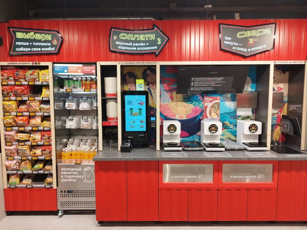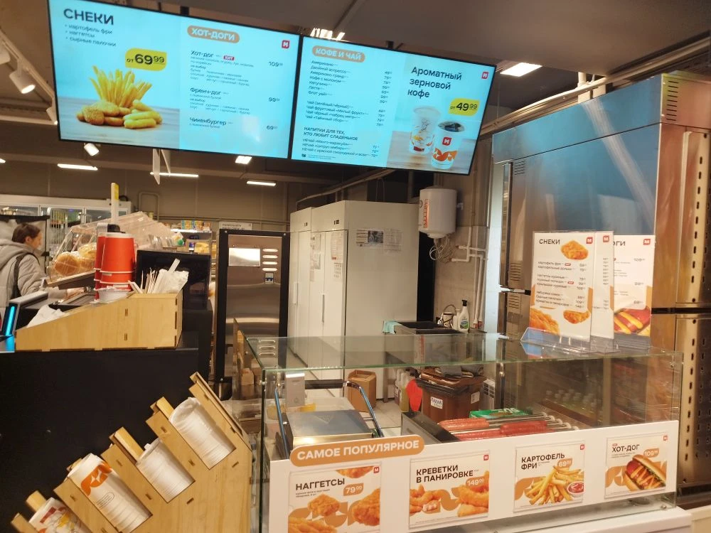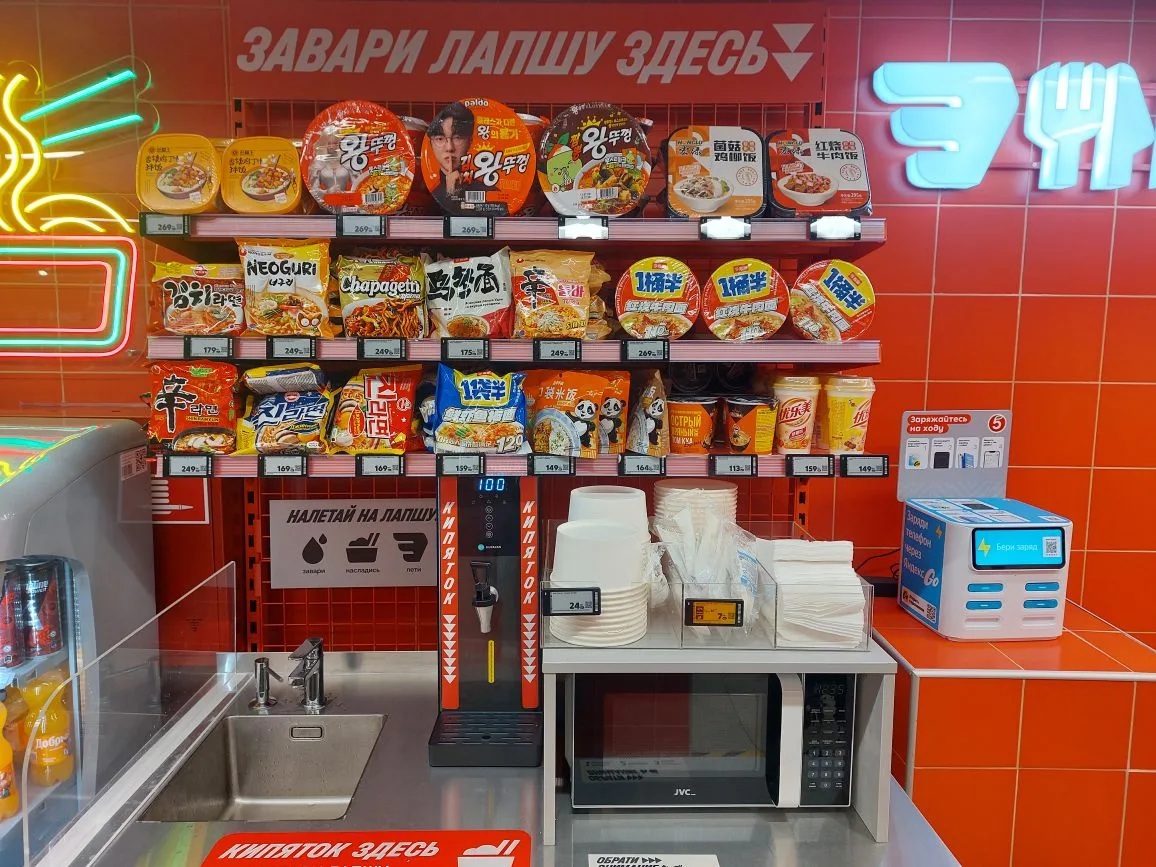 Как говорится, найдите разницу. Современный формат от «Магнита» с готовой едой, зоной кафе и раменоварками. Примечательно, что этот «Магнит» находится в одном здании со своим прямым конкурентом — «Пятёрочкой Налету». Похожи они друг с другом буквально до степени смешения. Спасибо за фото нашему подписчику.