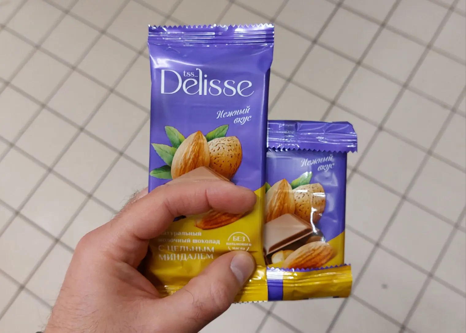 Игра с упаковкой. Реальный размер шоколадки Delisse (СТМ «Ленты», 60 граммов) и визуальный размер, который достигается за счёт создания пустоты с двух сторон. Благодаря этому шоколадка на полке выглядит как большинство других плиток.