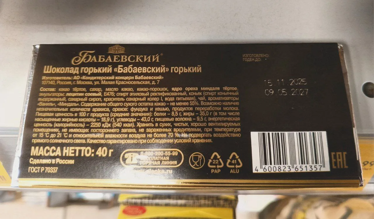 Шоколад «Бабаевский» стал весить уже 40 граммов. Не будем утверждать, что это новинка, но можно предположить, что некий «эксклюзив» для «Пятёрочки», которой надо держать «низкие цены». Потому что на сайте «Объединённых кондитеров» (куда входит холдинг «Бабаевский») нет такой позиции, там только 20- и 60-граммовые плитки. Как нет её и в официальном интернет-магазине производителя. Спасибо за фото нашему подписчику.